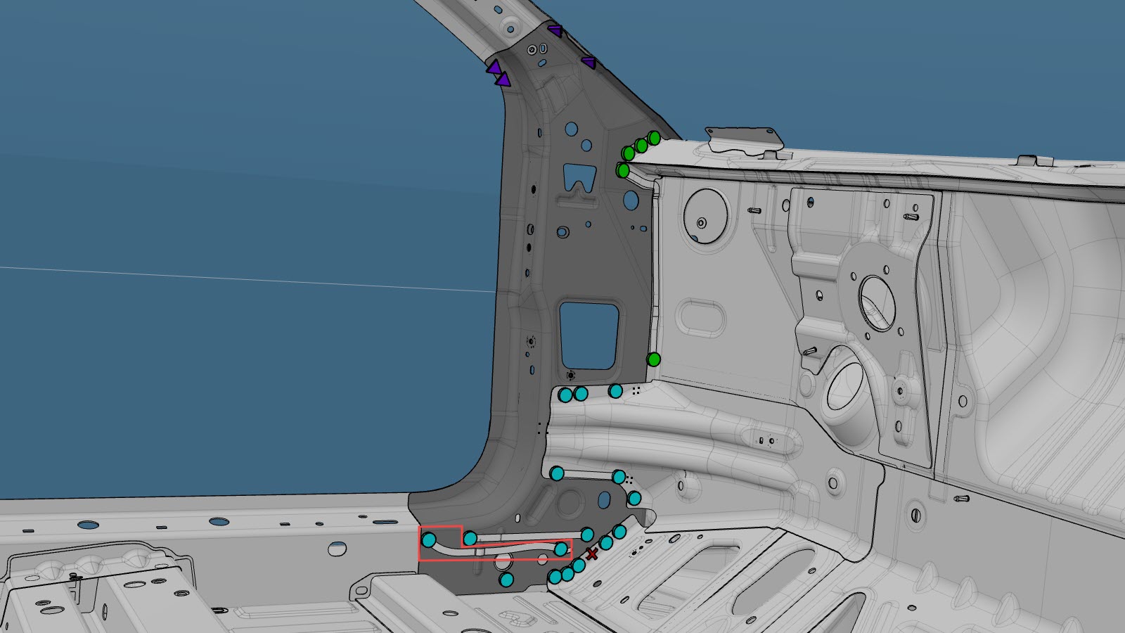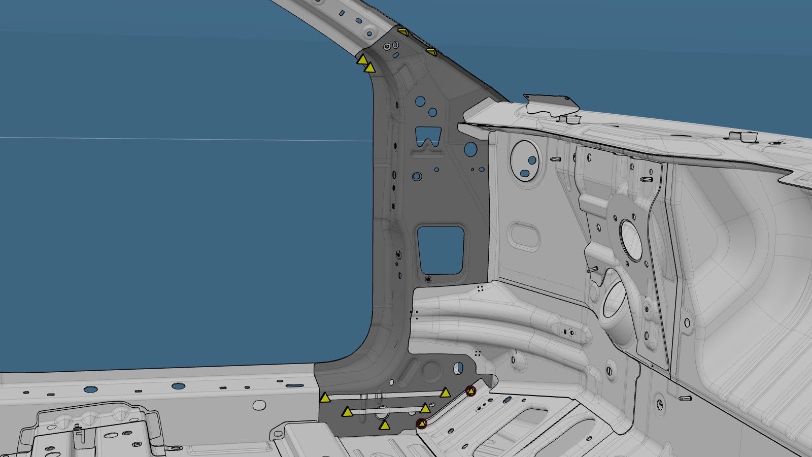 NoteA red X indicates a location where a factory-installed fastener is not being replaced.NoteTo avoid clash with the Sill Insert, the holes for rivets highlighted in red are created from outside the vehicle, but the rivets are installed from inside the vehicle.