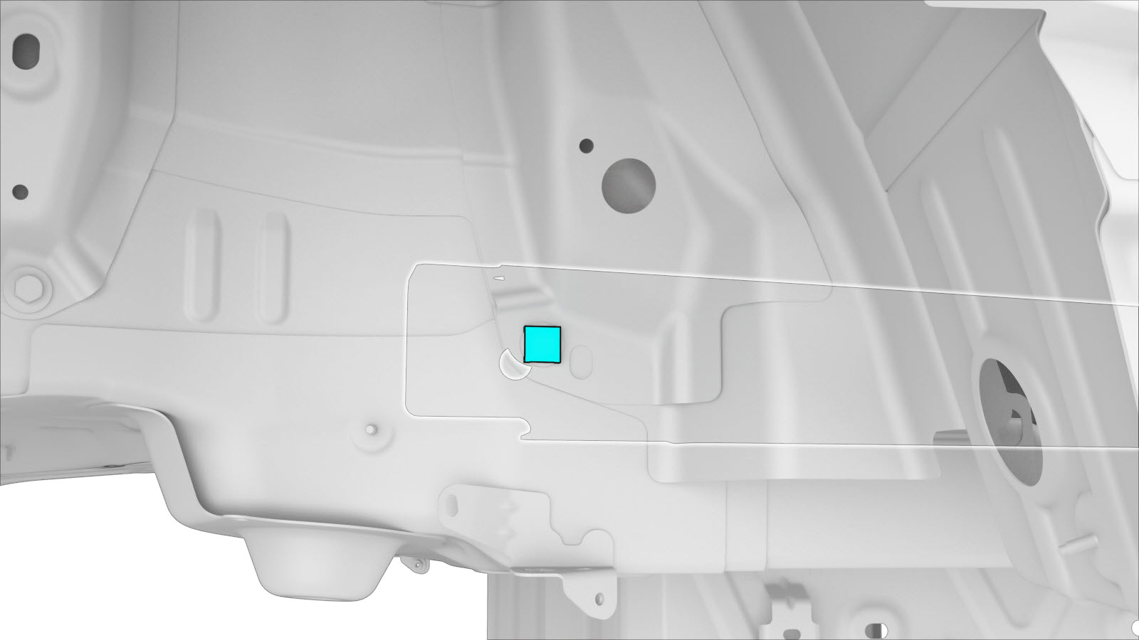 o Soldaduras por puntos de fábricao SPR de fábricaNotaLos remaches autoperforantes de fábrica rodeados en rojo están ocultos detrás del travesaño y deben rectificarse desde el interior del raíl del bastidor. Al rectificar los remaches autoperforantes, lije solo lo suficiente para retirar el componente; no extraiga completamente los remaches autoperforantes de la junta. Estos remaches no se sustituyen al instalar el nuevo raíl superior trasero y las partes restantes de estos remaches autoperforantes se dejan en la junta para mantener alguna conexión mecánica con el mamparo interior.