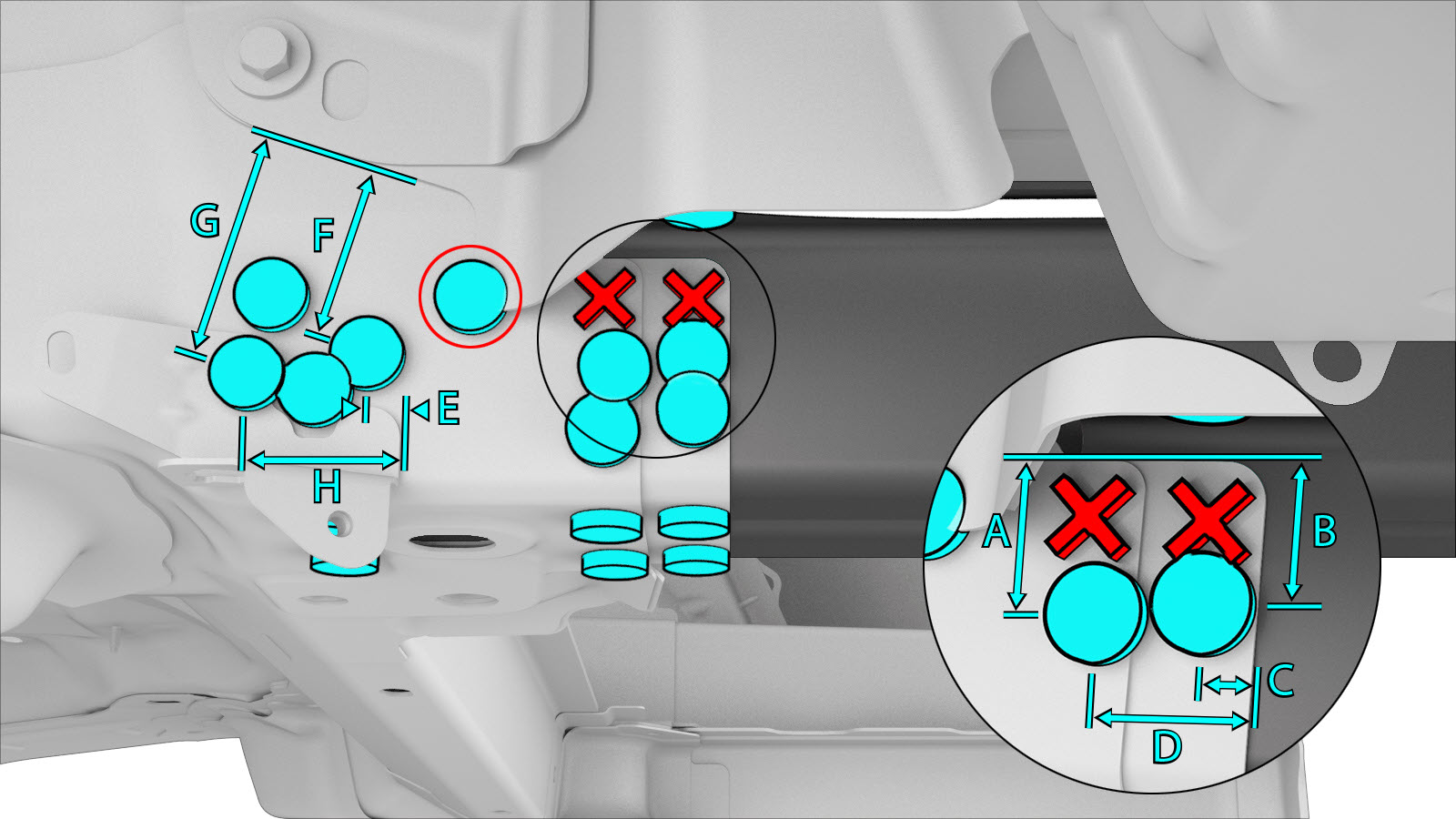 o Remaches estructurales de alta resistencia, 6,5 mmNotaUna X roja indica una ubicación en la que no se está sustituyendo una fijación instalada de fábrica.