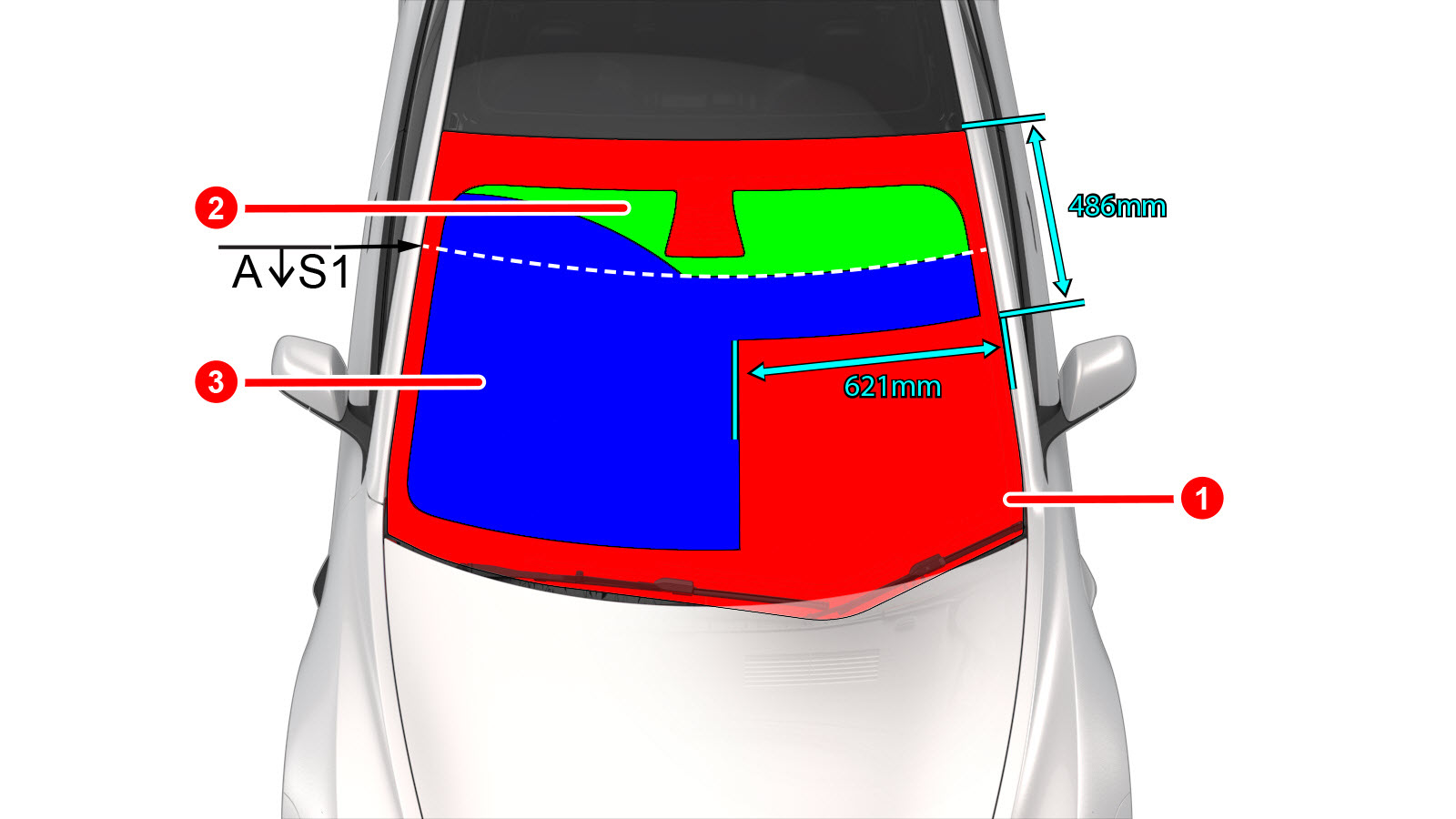 Área 3 (se muestra en azul en las imágenes anteriores) El área de reparación 3 es la zona debajo de la línea AS1 que desciende hasta el borde superior del área inferior de la frita (804 mm). Nota El área de reparación del lado del conductor se encuentra dentro de la zona de contacto del barrido del limpiaparabrisas. |