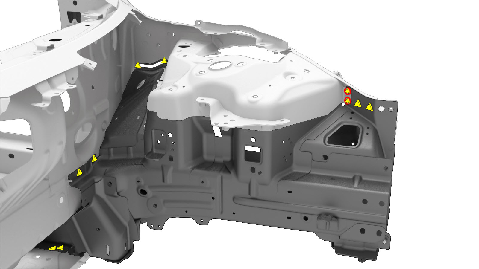 - Aplique adhesivo estructural a las superficies de contacto de la parte superior longitudinal de la pieza de servicio del raíl delantero completo.