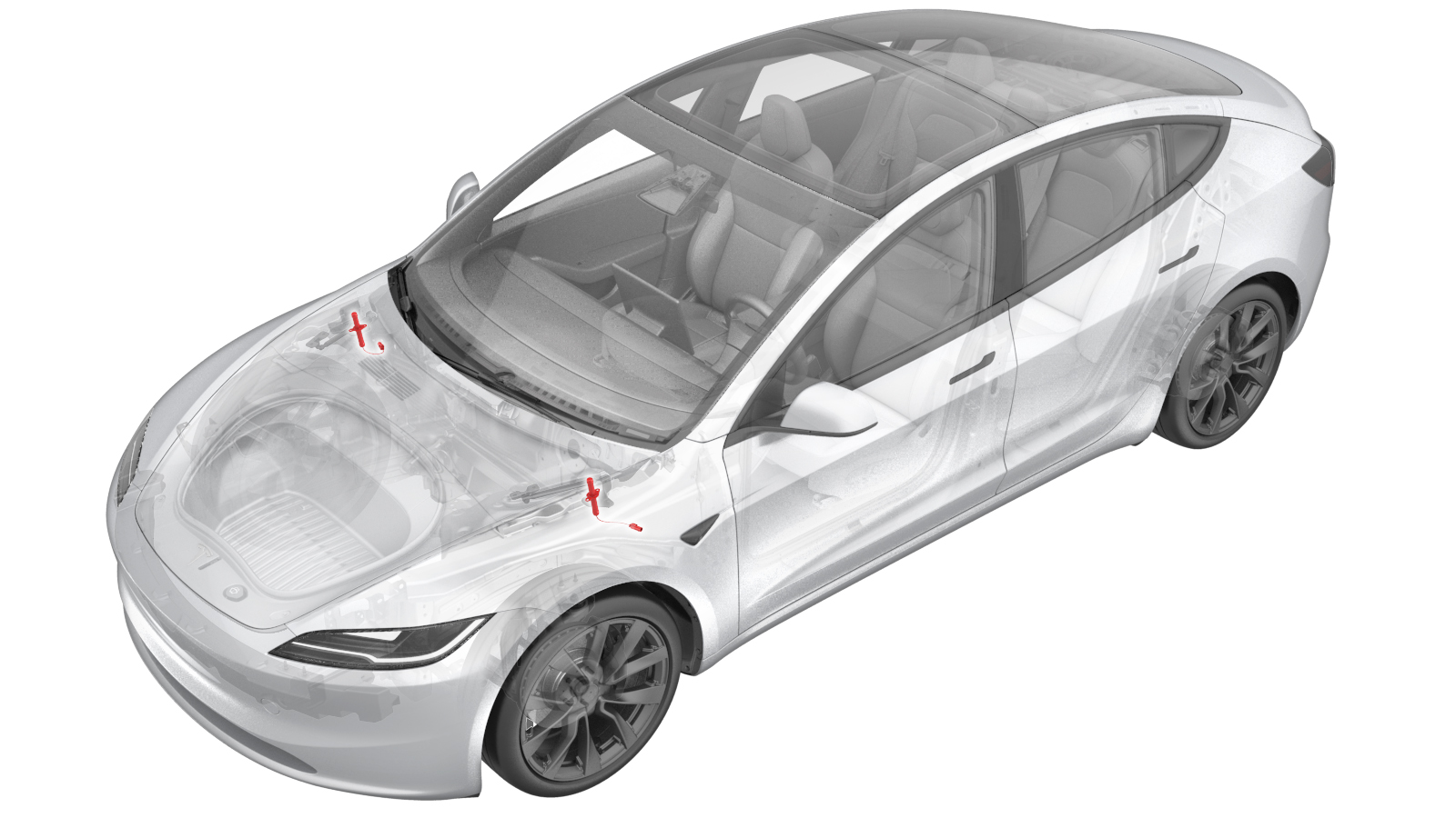2024+ Model 3 차량에는 압력 감지 튜브 및 후드 액추에이터와 같은 보행자 보호 장치 부품이 장착되어 있습니다.