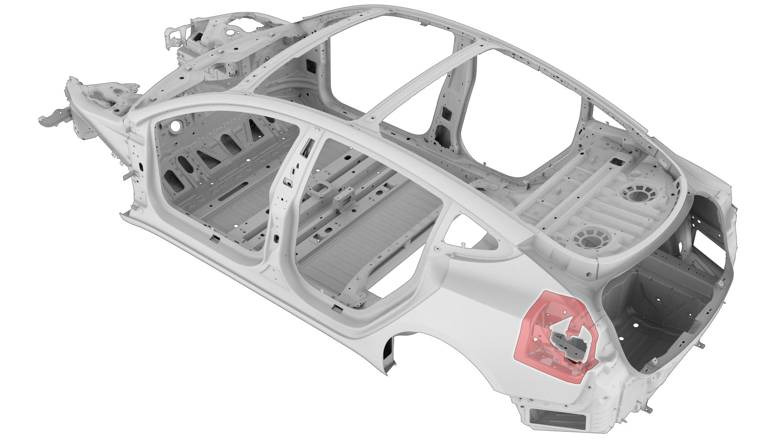 충전 포트 하우징 브래킷이 쿼터 패널 스킨과 공장 출고 폼 배플 (여기서는 주황색으로 표시됨)에 직접 닿는 부위에 심 실러를 도포합니다.