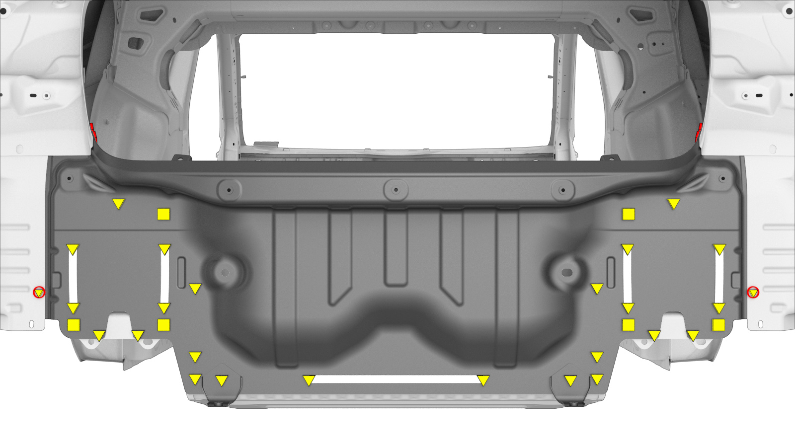 참고빨간색 X는 공장 출고 장착 패스너를 교체하지 않는 위치를 나타냅니다.또는 구조용 벌브 리벳, 6.5mm