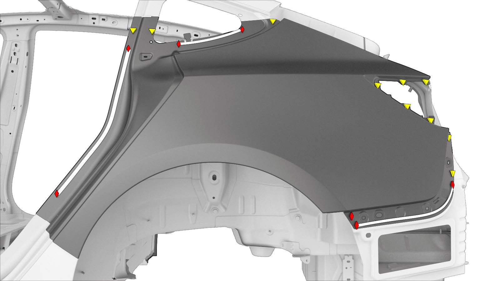충전 포트 하우징 브래킷이 쿼터 패널 스킨에 직접 닿는 부위에 심 실러를 도포합니다. (여기서는 주황색으로 표시).