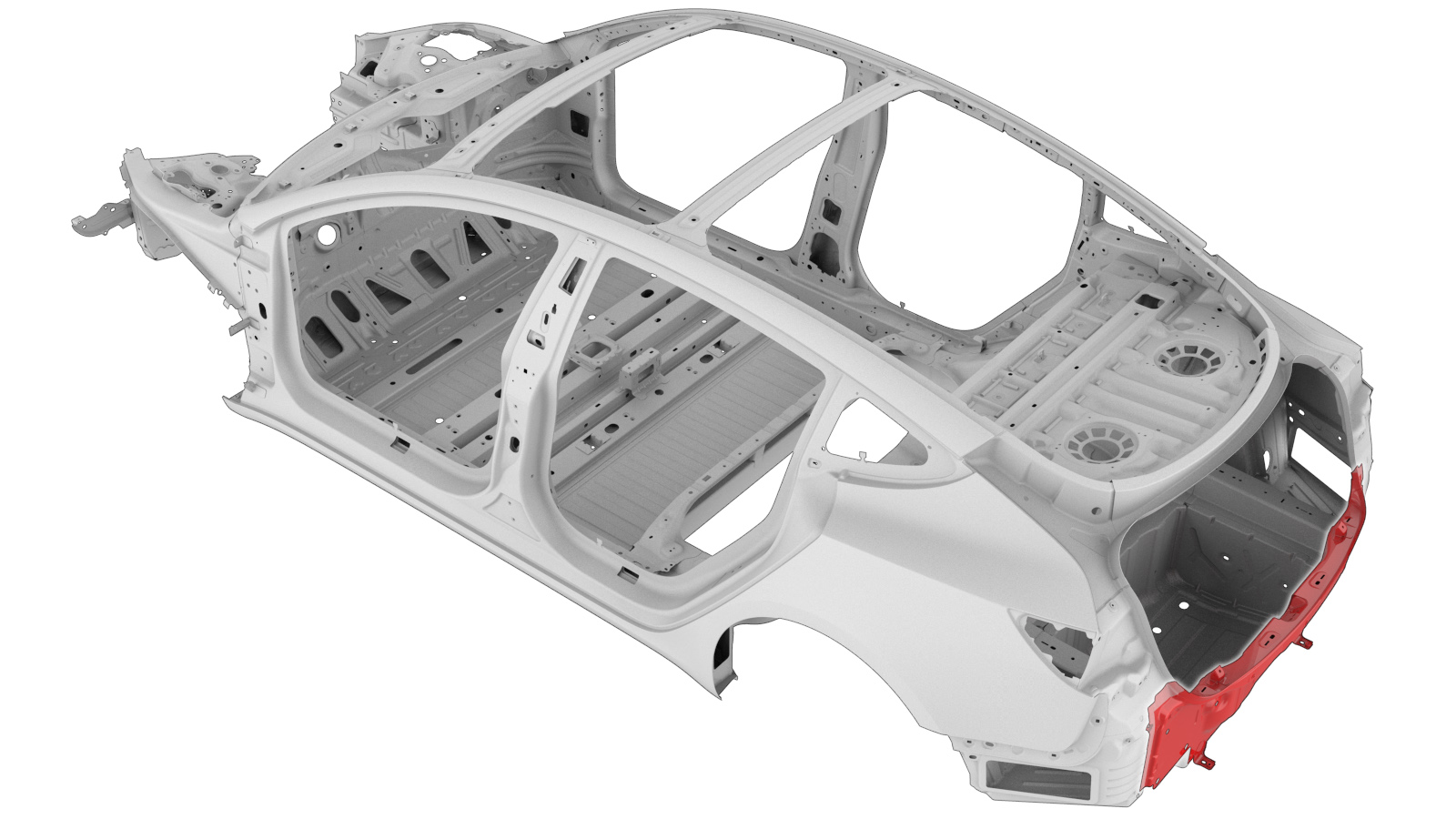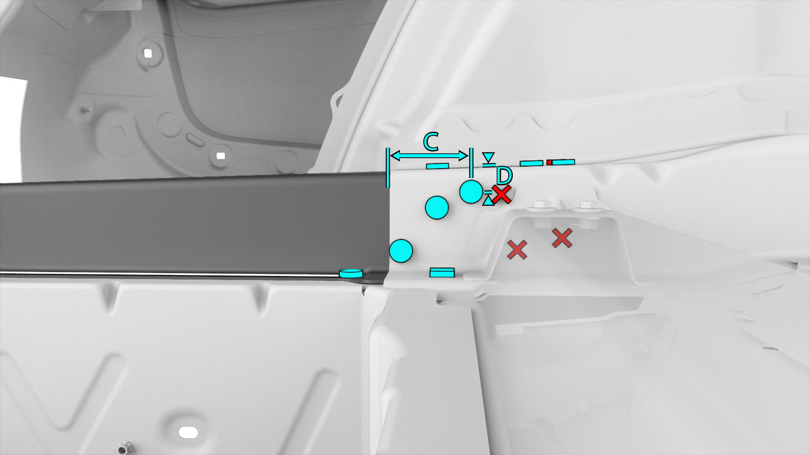 或 原厂点焊焊缝或 原厂 SPR注红圈标注的原厂 SPR 隐藏在横梁后侧,必须从车架纵梁内侧进行打磨。研磨 SPR 时,只需将 SPR 研磨至足够拆下组件的程度;不要将 SPR 从接头上完全拆下。安装新的后纵梁上部时,不会更换这些铆钉,这些 SPR 的剩余部分留在接头中,以保持与内侧隔板的某种机械连接。