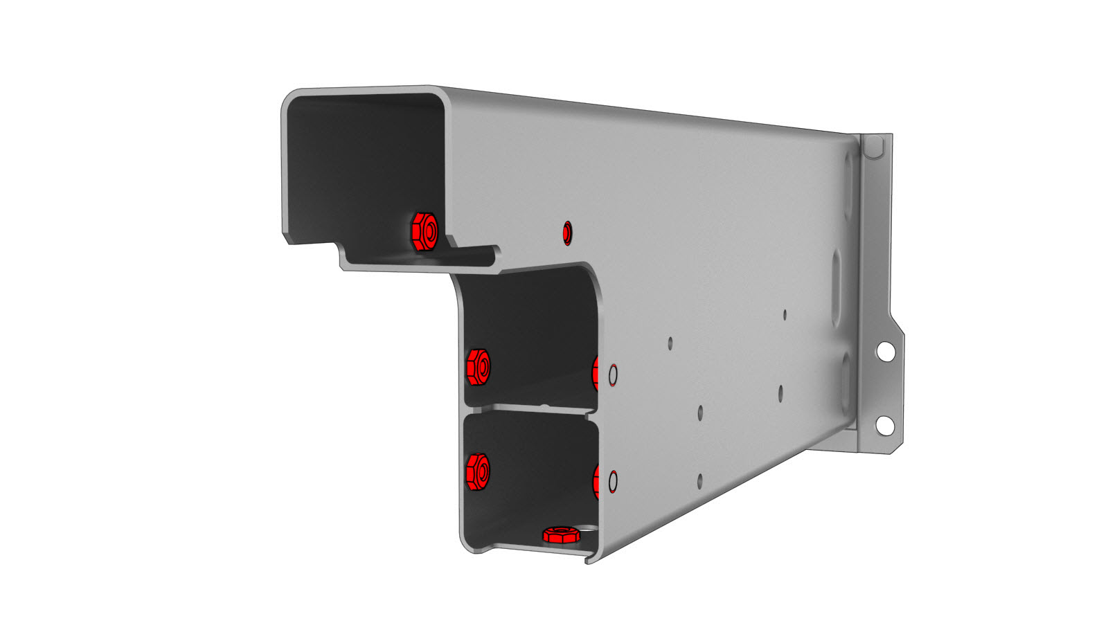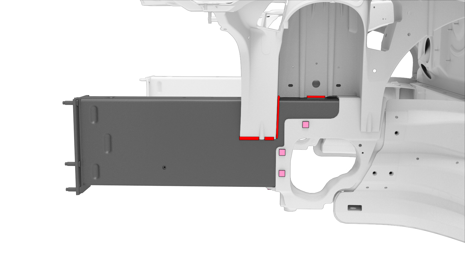 Wenn der neue vordere Rahmenträger mit vorinstallierten SPAC-Muttern ausgestattet ist: Entfernen Sie ausreichend Material vom vorderen Trägeradapter, um den Einbau der neuen Torx-Schrauben zu ermöglichen.