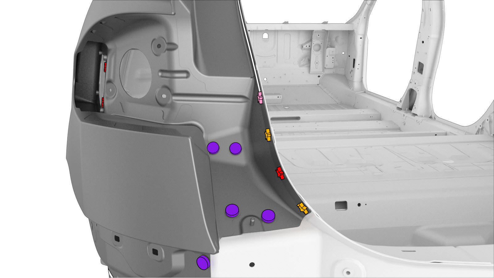 - Karosserieseite außen, Beschreibungen zu Abschnitten Es liefert Informationen darüber, wo und wie die äußere Karosserieseiten-Baugruppe (oder Unterbaugruppen davon) nach Bedarf geteilt wird (werden), um beschädigte Bereiche des äußeren Karosserieseitenblechs zu ersetzen oder um Zugang zu darunterliegenden Teilen der Fahrzeugstruktur zu erhalten. Verwenden Sie die Beschreibungen zum Teilen, um zu bestimmen, wo Sie die äußere Karosserieseiten-Baugruppe erfolgreich teilen können, um die entsprechende Reparatur durchzuführen.AnmerkungAbschnitte der äußeren Karosserieseiten-Baugruppe können einzeln oder in beliebigen Kombinationen von Abschnitten ersetzt werden, solange die referenzierten Schnittpunkte in diesem Dokument verwendet werden.AnmerkungMessungen anhand von Bohrlöchern werden von der Mitte der genannten Löcher aus durchgeführt, sofern in der Beschreibung zu Abschnitten nicht anders angegeben.