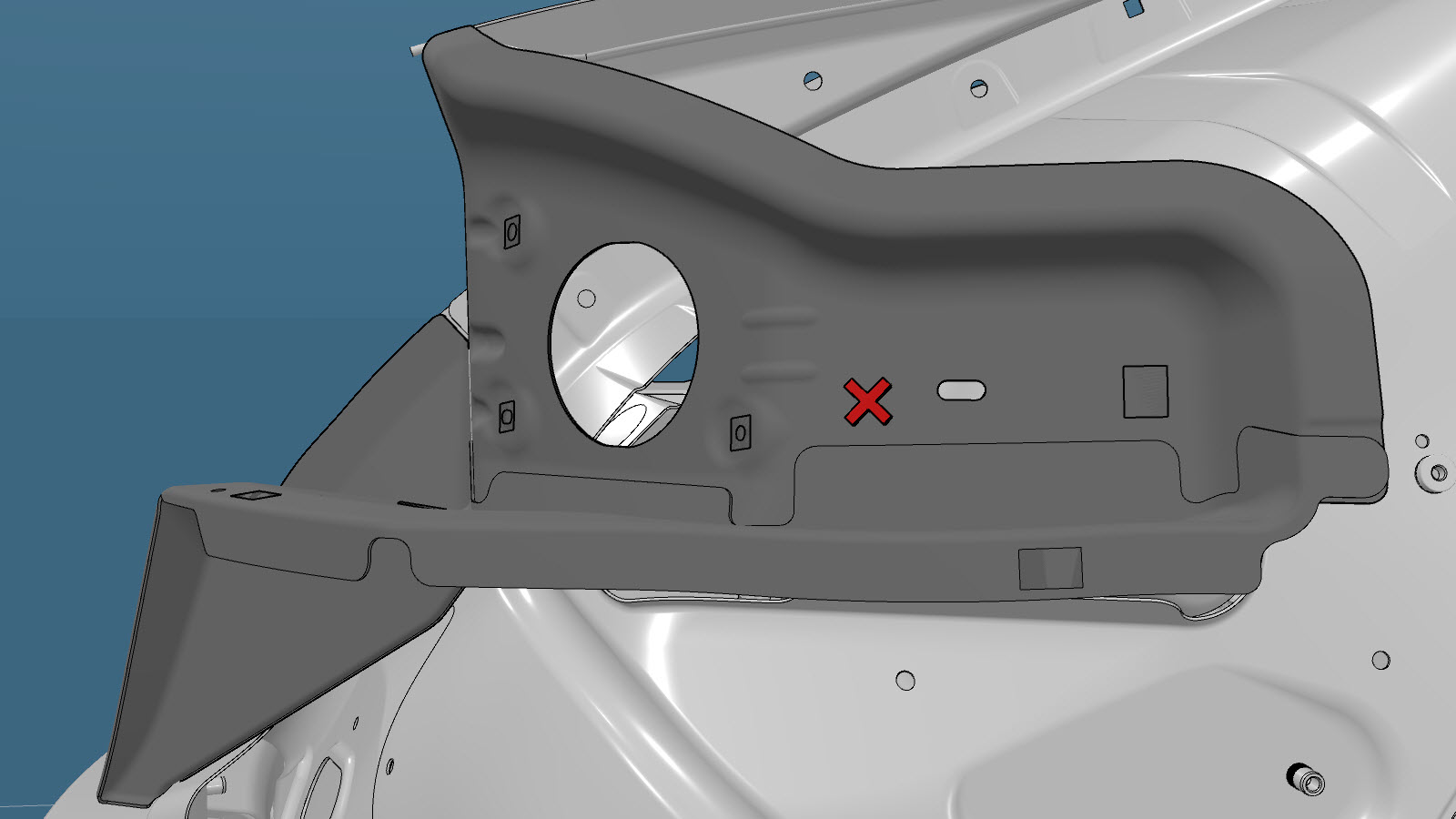 Entfernen Sie den erforderlichen Teil der Seitenwand – Fahrzeuge mit Ladeanschluss nicht für China, um das darunterliegende Bauteil, das entfernt werden soll, freizulegen.