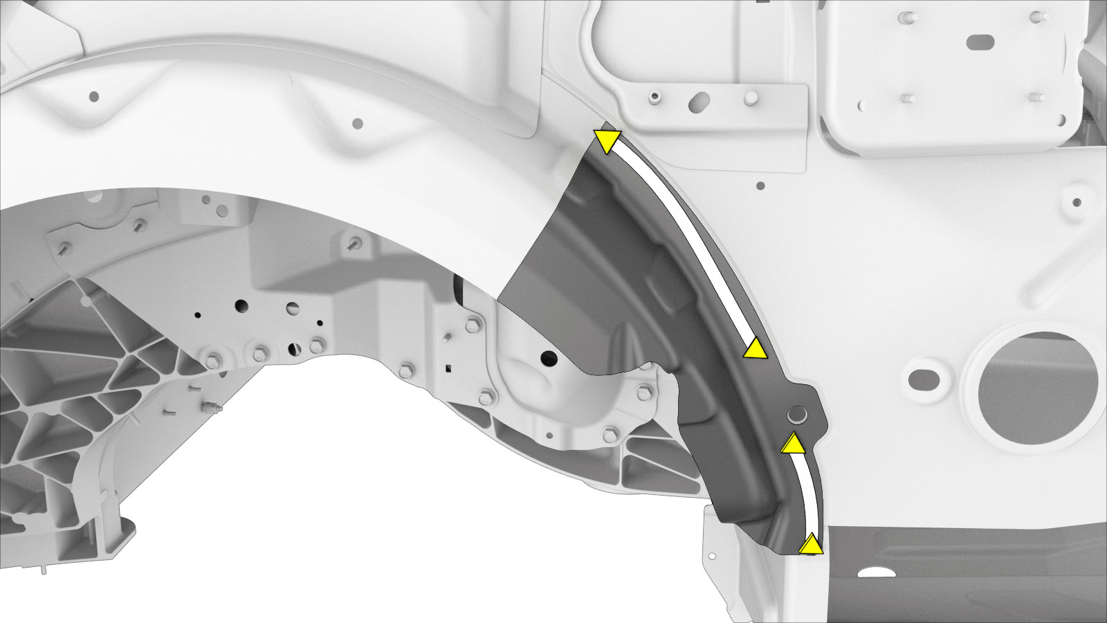 - La sezione Procedura di riparazione di questa procedura contiene le informazioni necessarie per sostituire la sezione posteriore della parte esterna del passaruota sui veicoli dotati di porta di ricarica per la Cina. Per sostituire la sezione posteriore della parte esterna del passaruota sui veicoli non dotati di porta di ricarica per la Cina, utilizzare la procedura Parte esterna del passaruota (sezione) - Veicoli con porta di ricarica non per la Cina. Se si sostituisce per intero la parte esterna del passaruota (non la relativa sezione posteriore), utilizzare la procedura Parte esterna del passaruota (completa).