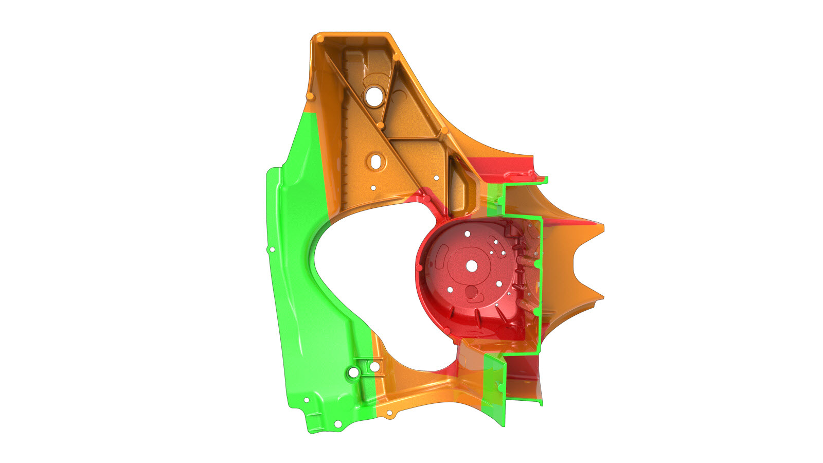 As imagens abaixo mostram diferentes ângulos da torre do amortecedor e contêm as áreas destacadas. Compare a área danificada da torre do amortecedor do veículo com as imagens abaixo e, em seguida, utilize os critérios de reparação que correspondem à cor da área destacada para localizar os critérios a usar para determinar se a área danificada do componente pode ser reparada.