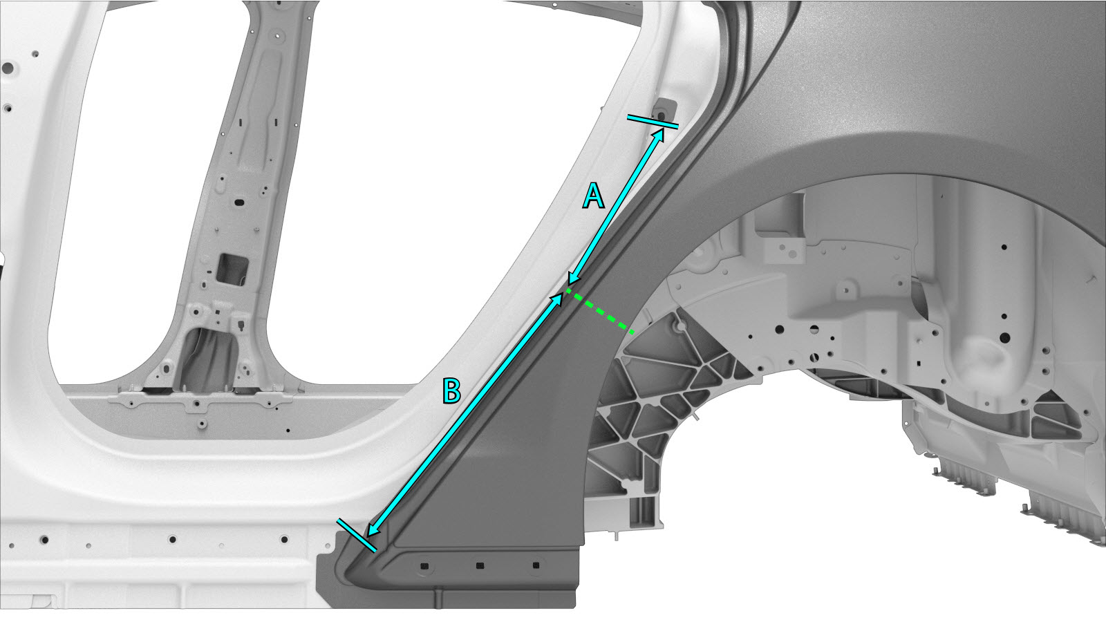 Como alternativa, em vez de substituir a totalidade do reforço do pilar C, é possível substituir a parte inferior da camada exterior de quarto utilizando a linha de corte descrita neste documento. |