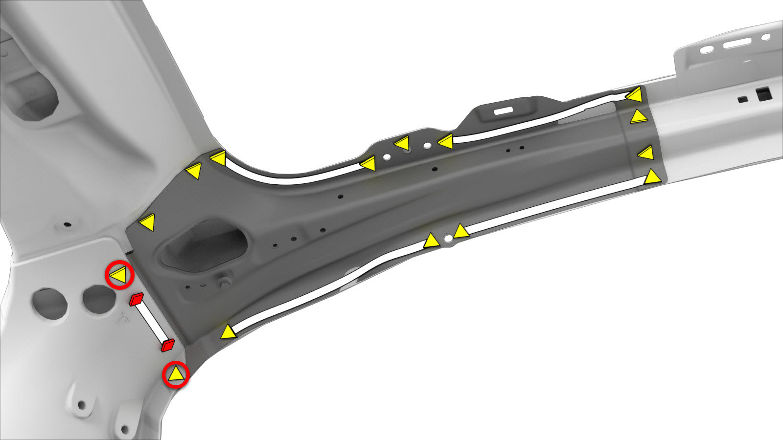 WarnungWenn beim Schweißen die Sicherheitsvorkehrungen nicht getroffen werden und keine persönliche Schutzausrüstung getragen wird, drohen schwere Verletzungen oder Sachschäden. Nur Techniker, die das Schweißtraining von Tesla erfolgreich abgeschlossen haben, dürfen Strukturteile an Tesla-Fahrzeugen schweißen.WarnungUm die Integrität des Fahrzeugs bei einem Unfall aufrechtzuerhalten, dürfen beim MSG-Schweißen von Aluminium an Tesla-Fahrzeugen nur ein zugelassener Schweißdraht und ein zugelassenes MSG-Schweißgerät verwendet werden. Informationen über zugelassene MSG-Schweißgeräte und Schweißdraht erhalten Sie unter Zugelassene MSG-Schweißgeräte und Schweißdrähte.ACHTUNGFühren Sie vor jeglichen Schweißarbeiten an einem Tesla-Fahrzeug zunächst das Verfahren zur elektrischen Isolierung von Fahrzeugen aus. (Weitere Informationen zum Verfahren zur elektrischen Isolierung von Fahrzeugen finden Sie im Servicehandbuch für das jeweilige Fahrzeug.) Beim Schweißen an einem Tesla-Fahrzeug mit aktivem Hochspannungs- oder Niederspannungssystem können Fahrzeugkomponenten beschädigt werden.AnmerkungVor dem MSG-Schweißen sollte eine Testschweißung an Material derselben Dicke und Art durchgeführt werden, um zu gewährleisten, dass mit den Einstellungen des Schweißgeräts eine den Anforderungen entsprechende Schweißverbindung hergestellt wird. - Führen Sie alle notwendigen Arbeitsgänge nach der Reparatur durch.
