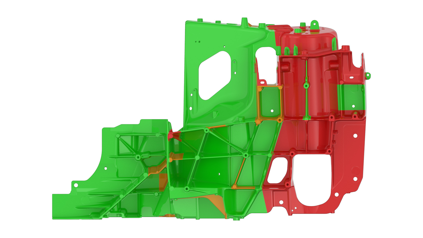 Die Abbildungen zeigen die Guss-Stoßdämpferbrücke aus verschiedenen Winkeln und enthalten hervorgehobene Bereiche. Vergleichen Sie den beschädigten Bereich des Federbeindoms am Fahrzeug mit den nachfolgenden Abbildungen, und verwenden Sie dann die Reparaturkriterien entsprechend der Farbe des hervorgehobenen Bereichs, um die Kriterien zu finden, mit denen bestimmt werden kann, ob der beschädigte Bereich der Komponente repariert werden kann.