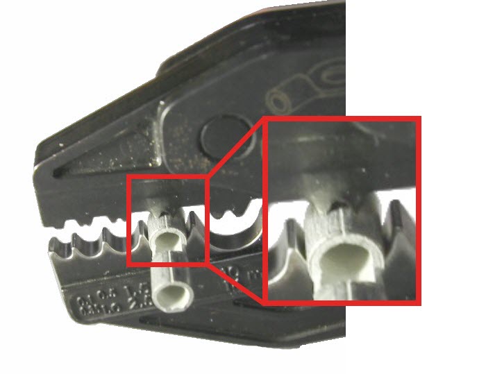 Die Crimphülse in den richtigen Kanal des Crimpwerkzeugs einsetzen und den Griff leicht zusammendrücken, um die Hülse festzuhalten. Der gezahnte Teil der Crimpmatrize sollte auf die Seite der Crimphülse mit der Fuge drücken.