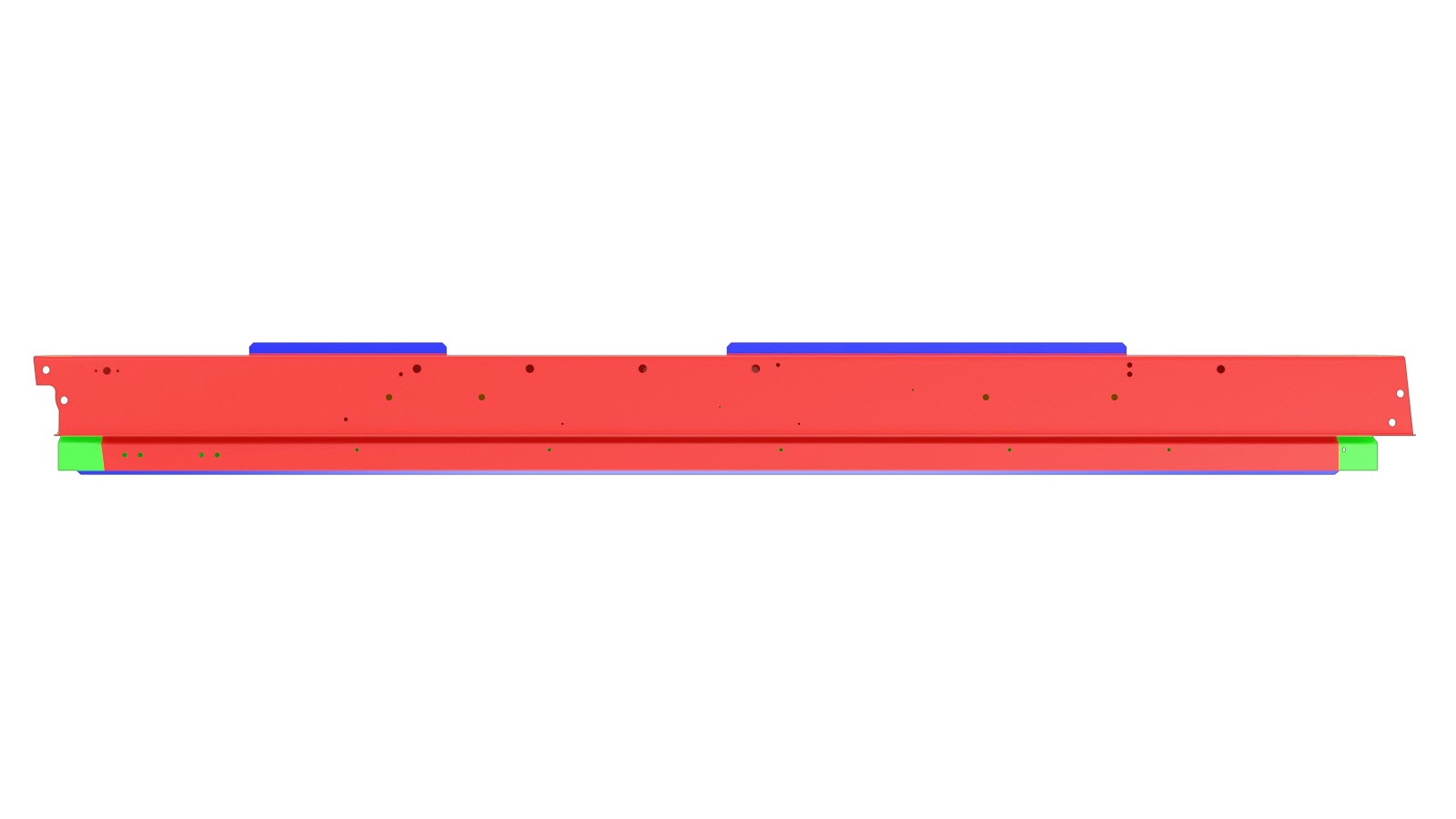 Die Abbildungen zeigen den Schweller aus verschiedenen Winkeln und enthalten hervorgehobene Bereiche. Vergleichen Sie den beschädigten Bereich des Schwellers am Fahrzeug mit den nachfolgenden Abbildungen, und verwenden Sie dann die Reparaturkriterien entsprechend der Farbe des hervorgehobenen Bereichs, um die Kriterien zu finden, anhand derer bestimmt werden kann, ob der beschädigte Bereich der Komponente repariert werden kann.