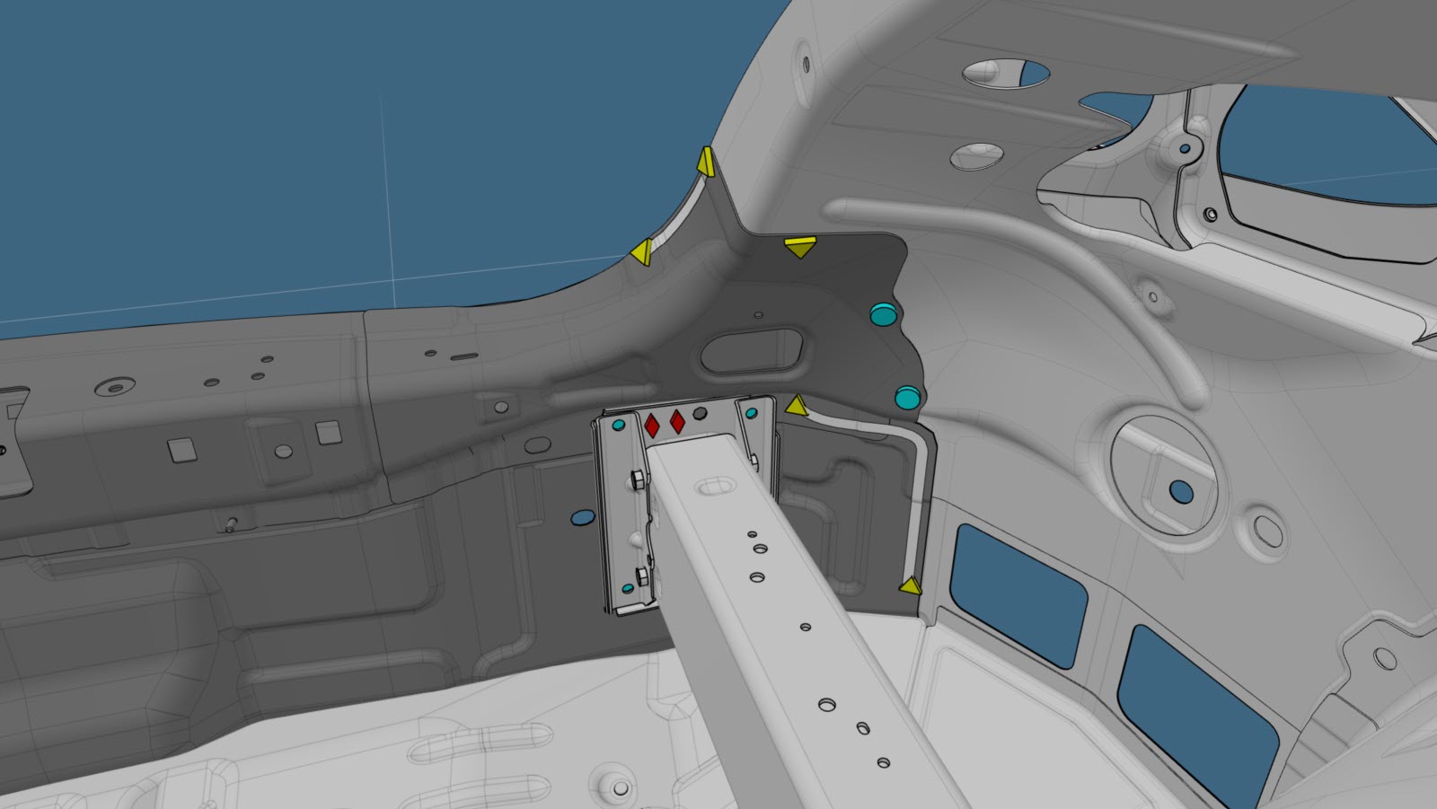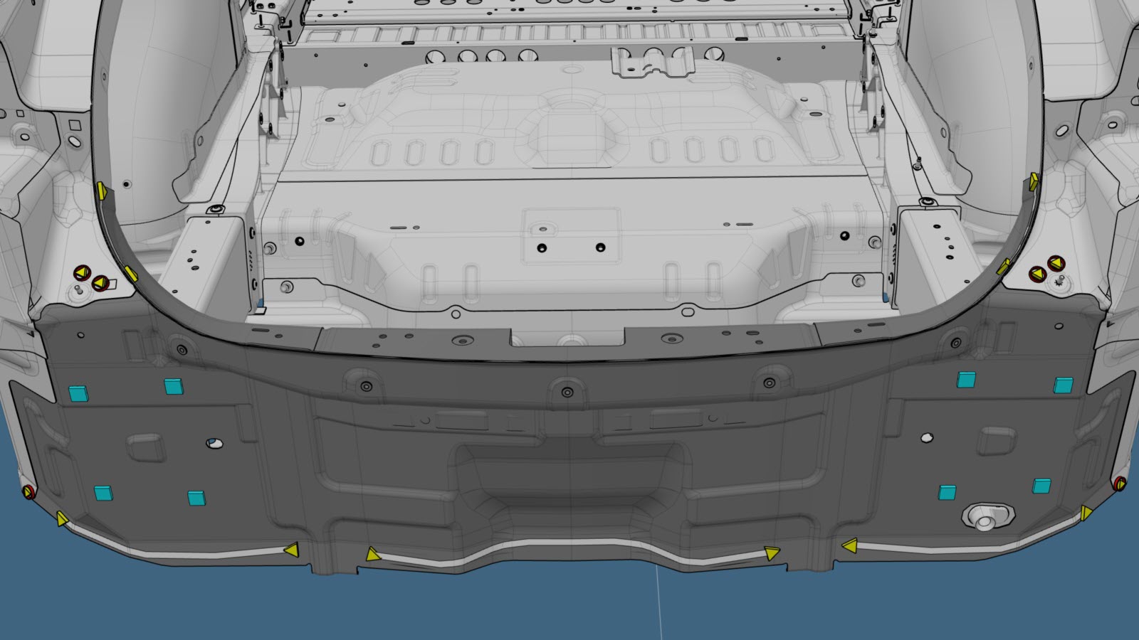o PernosNotaInstale los pernos desde el interior del vehículo a través de la placa final del raíl trasero, donde se retiraron los espárragos en el paso anterior. - Aplique adhesivo estructural en las superficies de contacto del vehículo y en el nuevo componente o componentes.