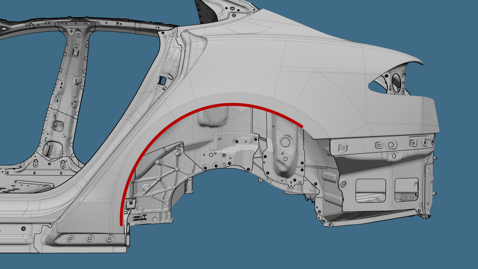 | Lors du découpage dans la zone du passage de roue, la bride du passage de roue dans la zone indiquée en rouge peut être soudée. |