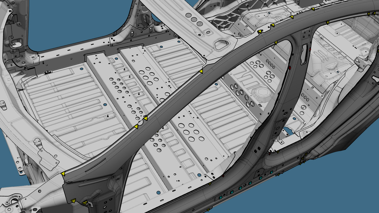| Aree gialle: | In queste aree il sezionamento è consentito. Dietro il pannello esterno, in queste aree, potrebbe esserci schiuma. Nota Se si esegue il sezionamento in queste aree, rimuovere la schiuma e pulire l'area per evitare la contaminazione della saldatura. |