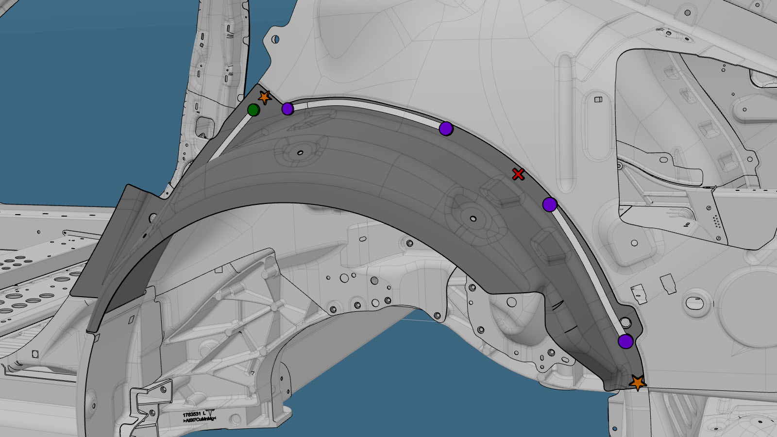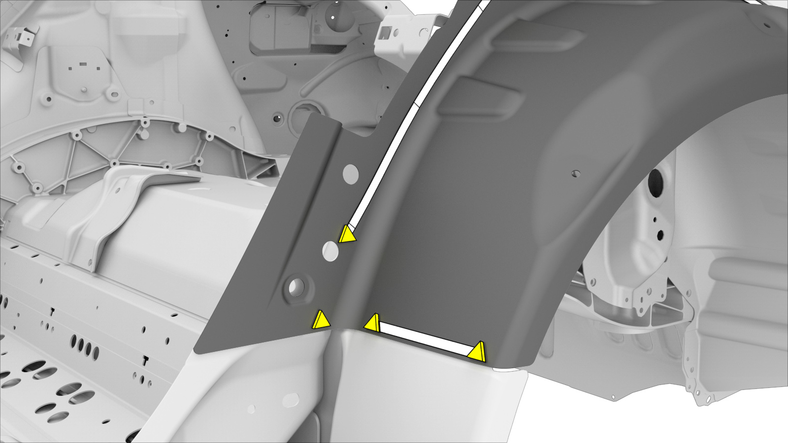 - 이 절차의 수리 절차 섹션에는 전체 휠하우스 외측을 교체하는 데 필요한 정보가 포함되어 있습니다. 휠하우스 외측 전체가 아닌 휠하우스 외측의 후면 섹션을 교체하는 경우 휠하우스 외측(섹션)(북미 외 제작 차량 전용) 절차를 따릅니다.