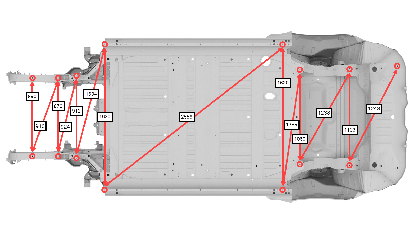 치수 측정은 차량 손상을 진단하고 차량을 원래 규격으로 되돌리기 위해 구조 수리가 필요한지 여부를 결정하기 위한 보조 요소로 사용됩니다.