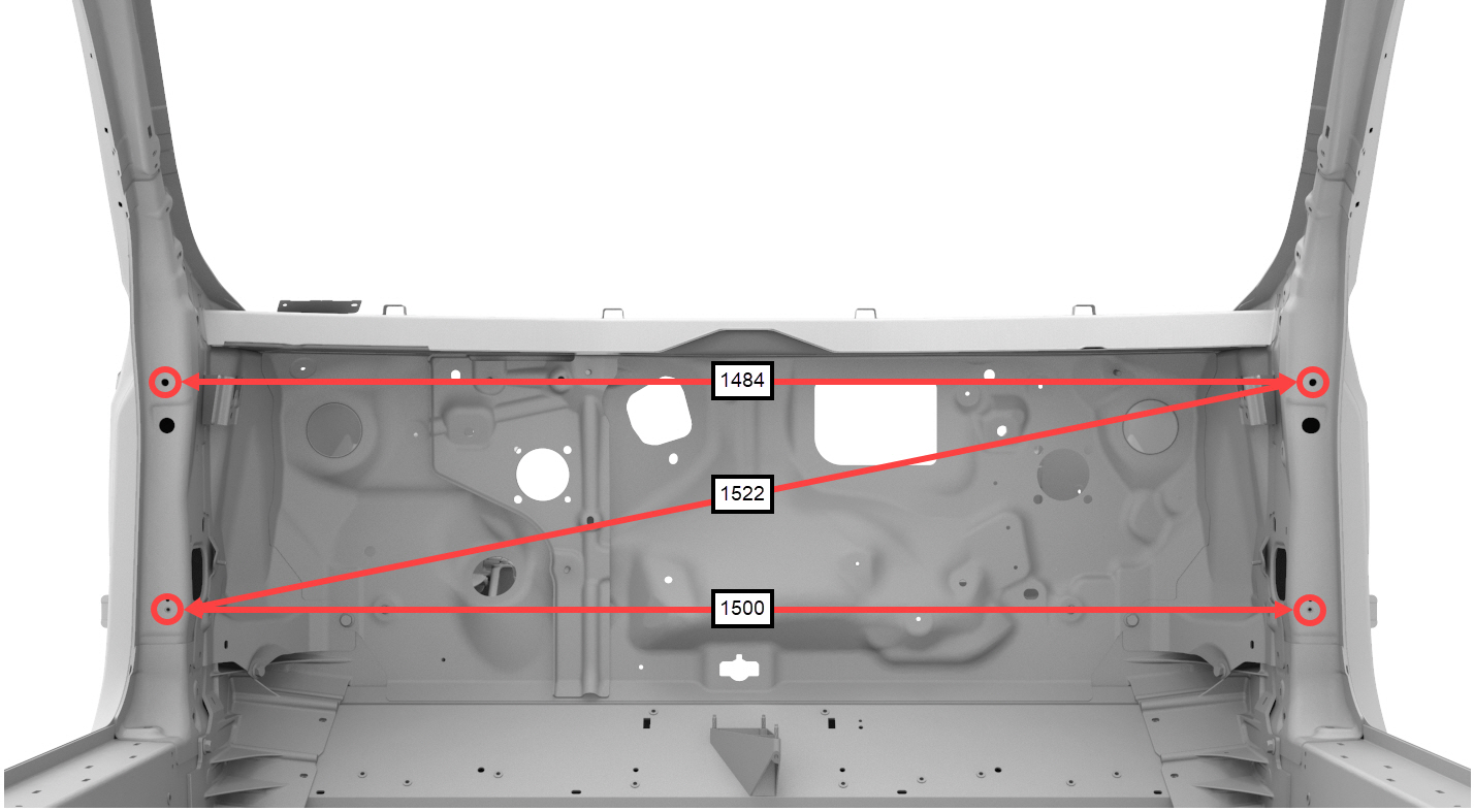 측정값이 규격을 벗어나는 경우 차량을 프레임 벤치 위에 올리고 다시 측정합니다. 측정값이 계속해서 규격을 벗어나는 경우 손상 정도를 평가하고 수리 견적을 작성하십시오.