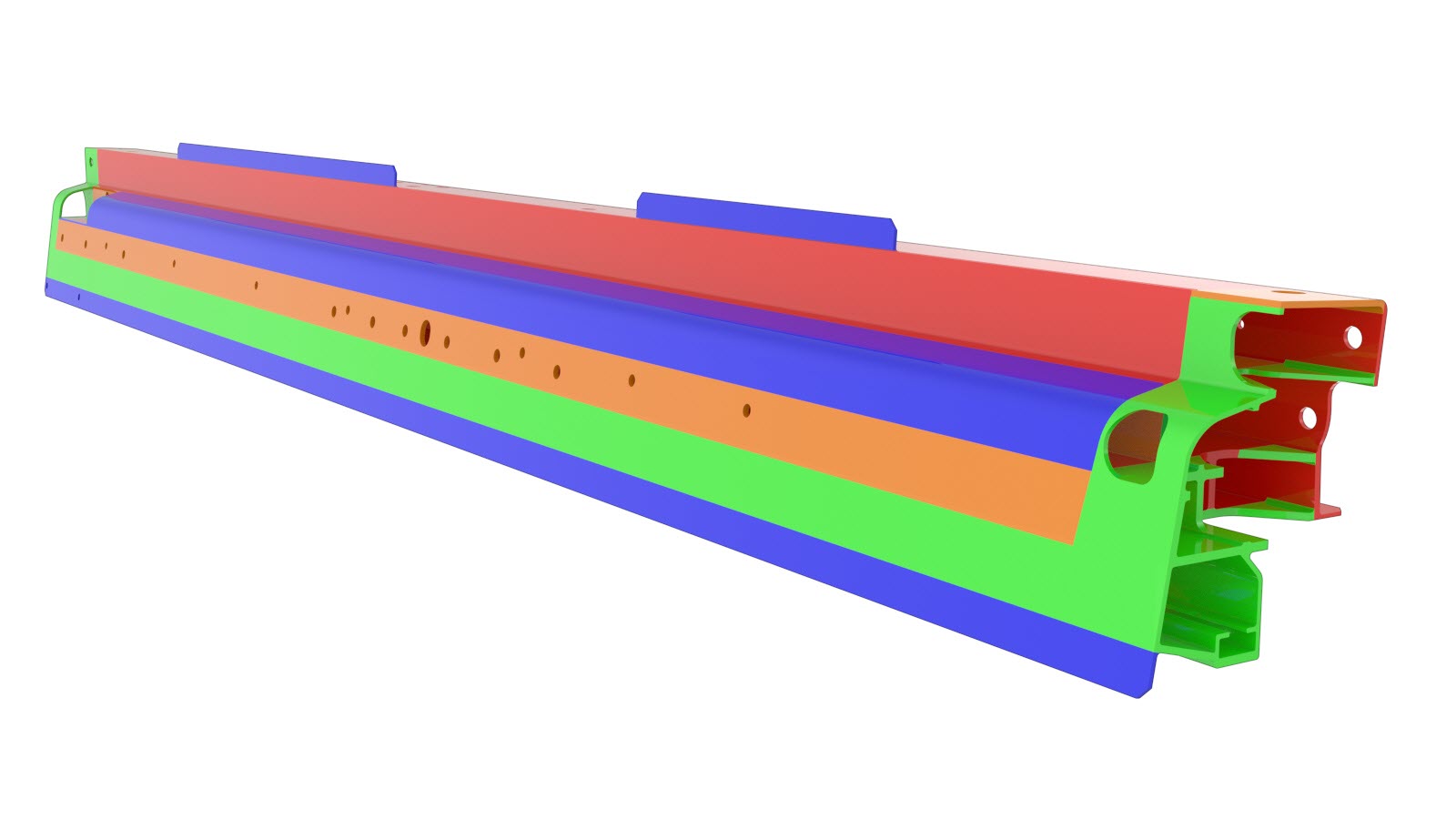 As imagens abaixo mostram diferentes ângulos da soleira e contêm as áreas destacadas. Compare a área danificada da soleira do veículo com as imagens abaixo e, em seguida, utilize os critérios de reparação que correspondem à cor da área destacada para localizar os critérios a usar para determinar se a área danificada do componente pode ser reparada.