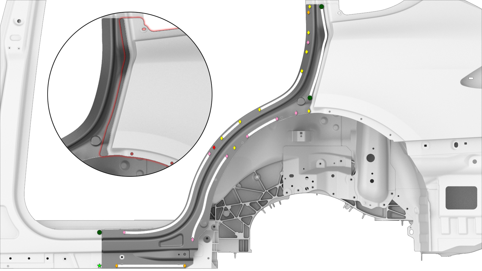 NotaUna X roja indica una ubicación en la que no se está sustituyendo una fijación instalada de fábrica.o Remaches avellanados, 4,8 mm, cortosNotaColoque remaches de cabeza avellanada en la unión entre el componente nuevo y el panel exterior de la aleta trasera, en el centro de la zona donde el nuevo componente y el panel subyacente se solapan (como se muestra en la imagen de referencia). Mida la longitud de solapamiento entre el nuevo componente y la parte subyacente del exterior de la aleta trasera y, a continuación, marque las ubicaciones de los remaches de cabeza avellanada de acuerdo con la longitud de solapamiento del panel.o SPRs, 5x4NotaSe necesita el siguiente troquel SPR de Tesla para instalar este SPR: KA 075 2113.o SPRs, 5x4,5NotaSe necesita el siguiente troquel SPR de Tesla para instalar este SPR: KA 075 2113.o SPRs, 5x5NotaSe necesita el siguiente troquel SPR de Tesla para instalar este SPR: KA 075 2113.o SPRs, 5x6 H4NotaSe necesita el siguiente troquel SPR de Tesla para instalar este SPR: SM 085 0125.