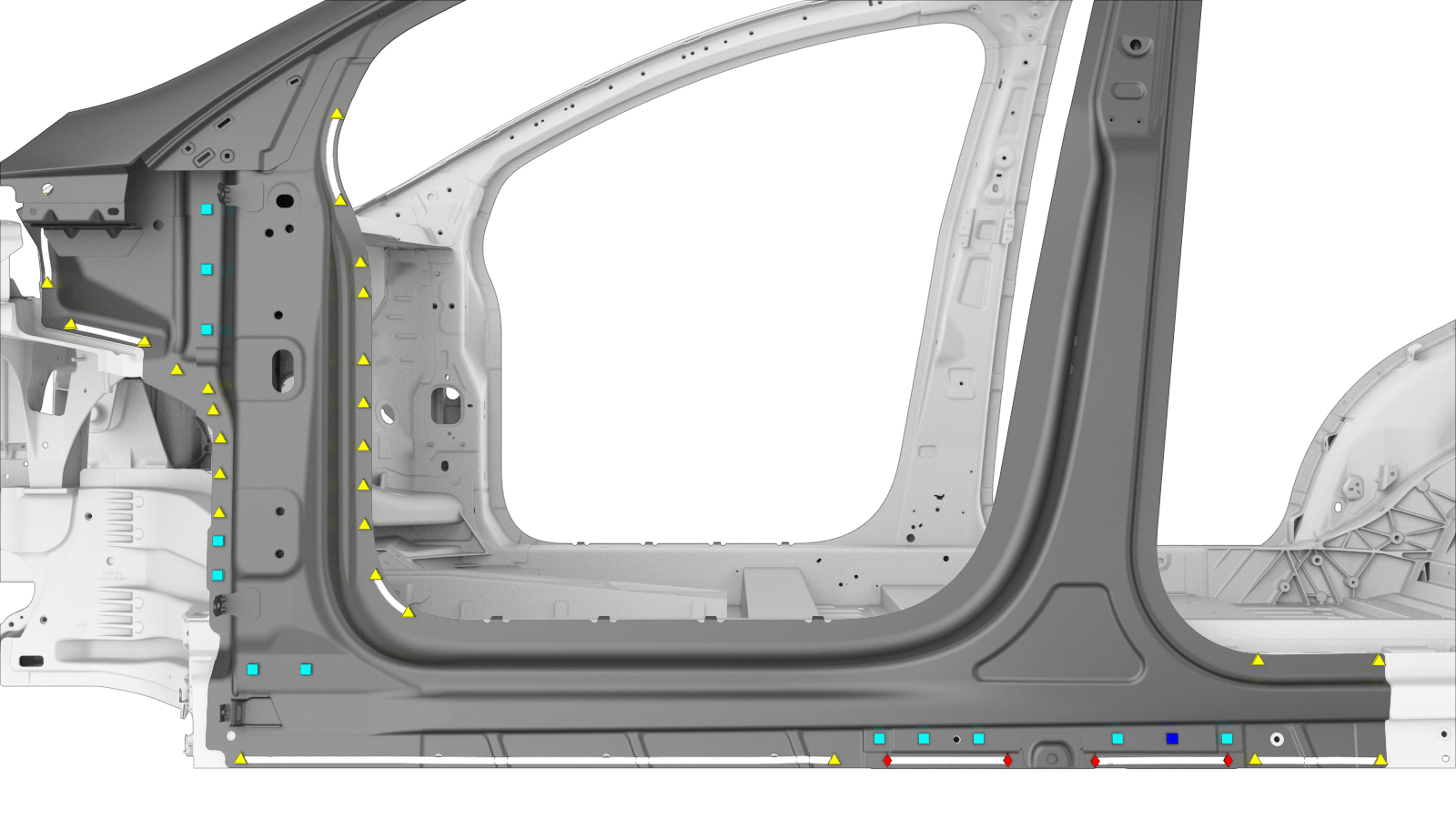 Aplique espuma estructural a la zona del pilar B superior en el nuevo conjunto completo del lateral de la carrocería y al vehículo, concretamente en las áreas indicadas en amarillo.