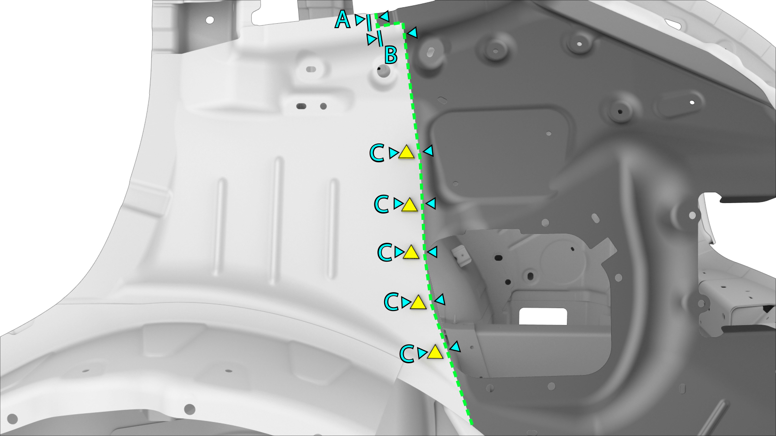NotaNo retire los puntos de soldadura utilizados para la medición. En su lugar, corte 15 mm en la parte trasera de los puntos de soldadura indicados.Línea de corte