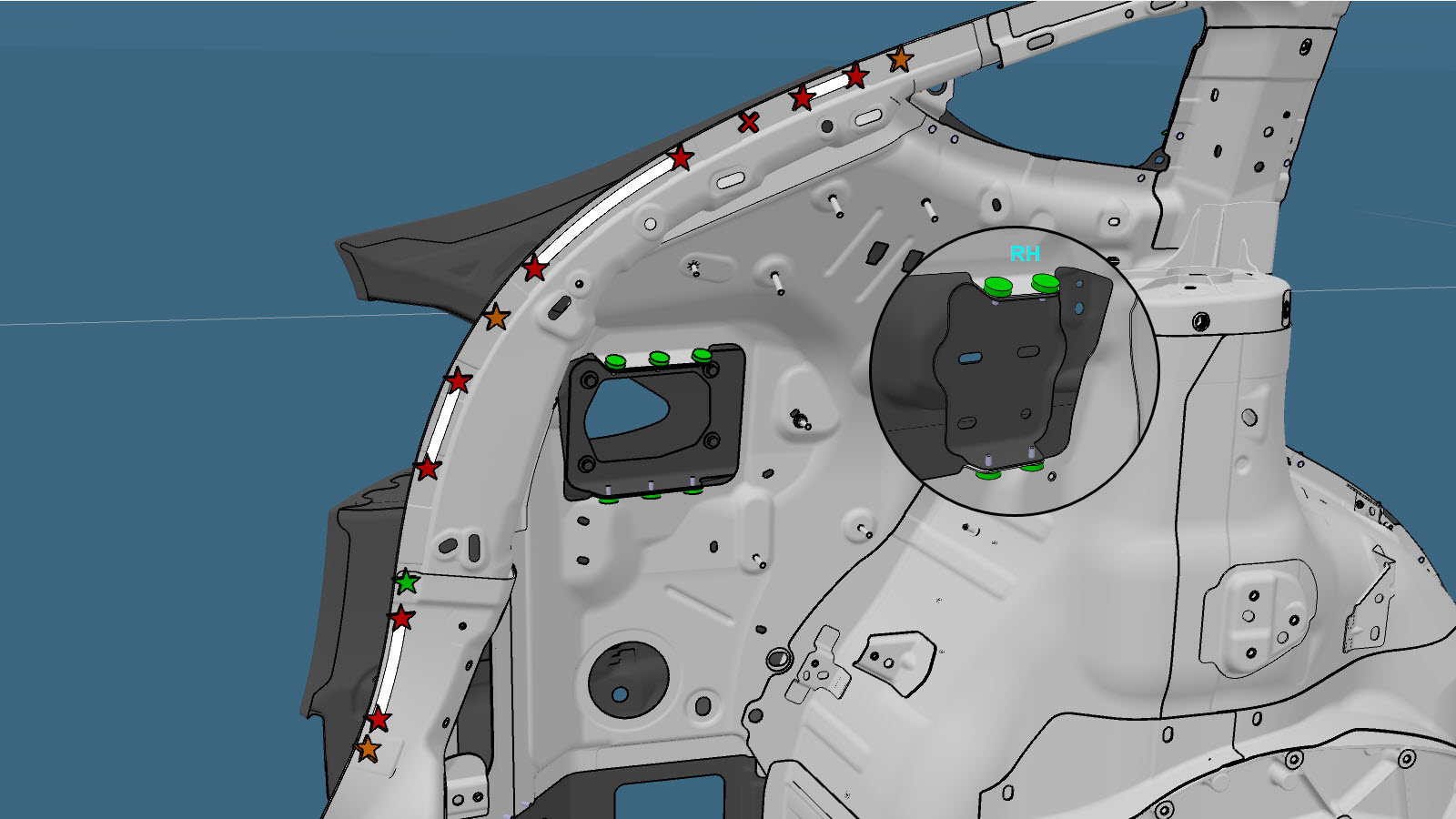 NotaUtilice herramientas de instalación de elementos de fijación que tengan una holgura adecuada cuando instale elementos de fijación cerca de la batería de alta tensión. Retire la batería de alta tensión únicamente si no hay espacio suficiente para instalar los elementos de fijación.NotaUna X roja indica una ubicación en la que no se está sustituyendo una fijación instalada de fábrica.