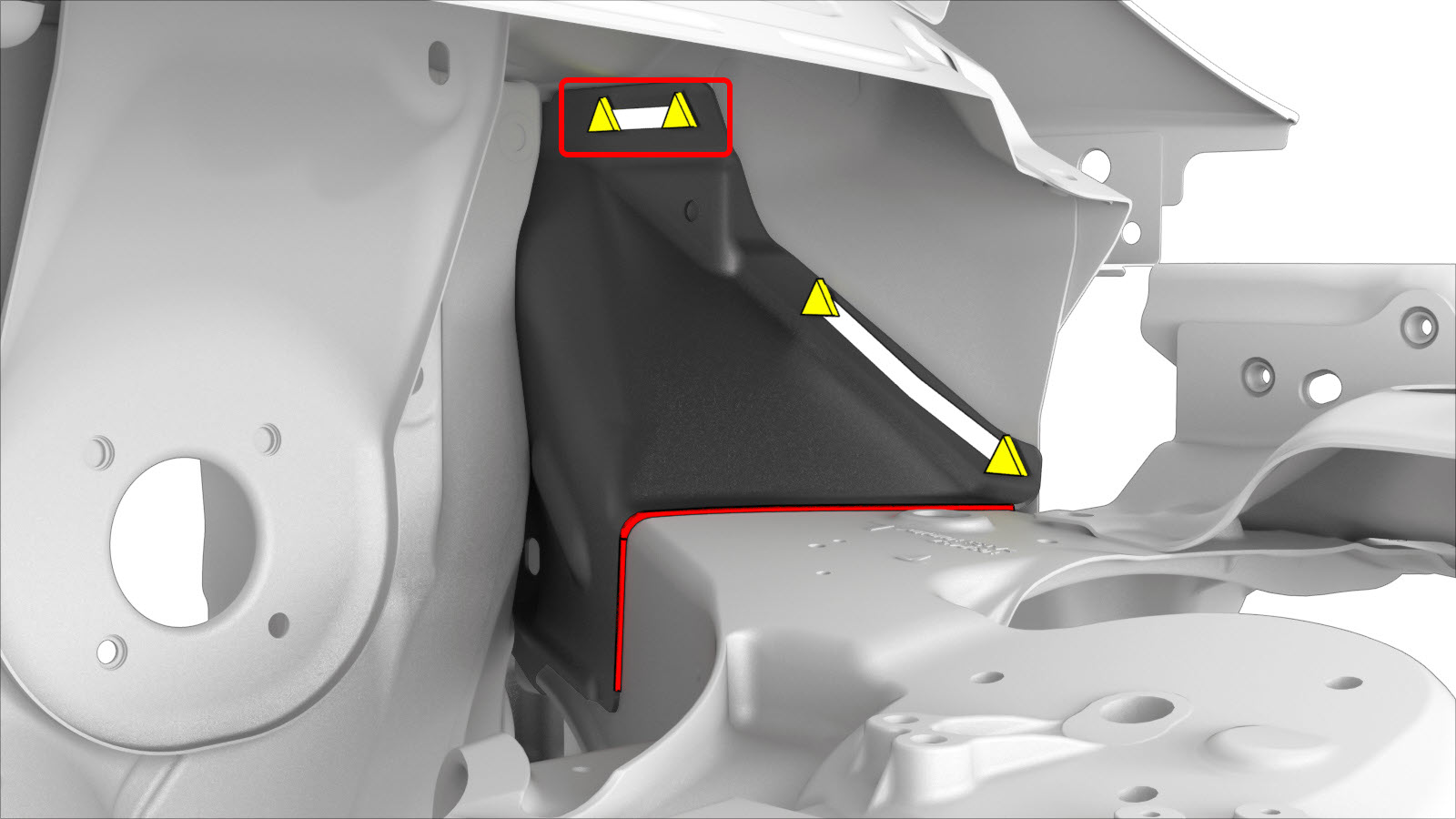 o Perfore a través de las soldaduras por puntos de fábricaNotaAl perforar soldaduras por puntos, utilice una broca que cree un orificio del tamaño correcto para la fijación que sustituirá a la soldadura por puntos.AvisoEn las zonas resaltadas en rojo, no perfore ni dañe los paneles subyacentes. -