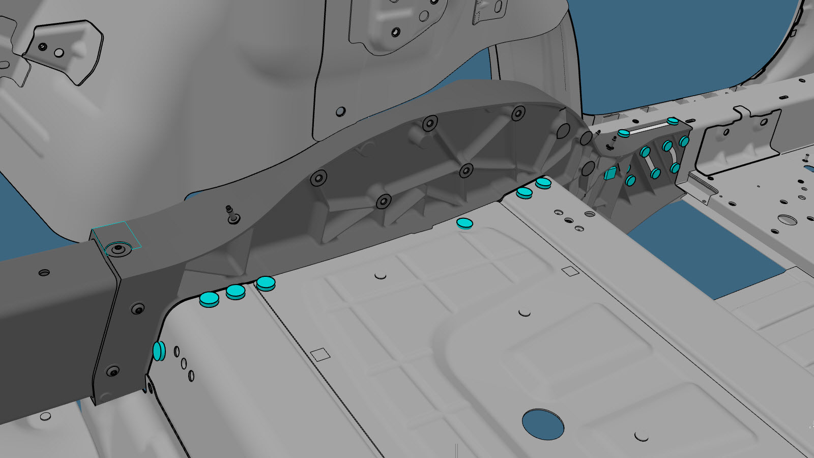 구조용 접착제를 사용하여 후면 토크 박스 하부 크로스멤버와 새 후면 노드의 위치에 너트를 고정합니다.