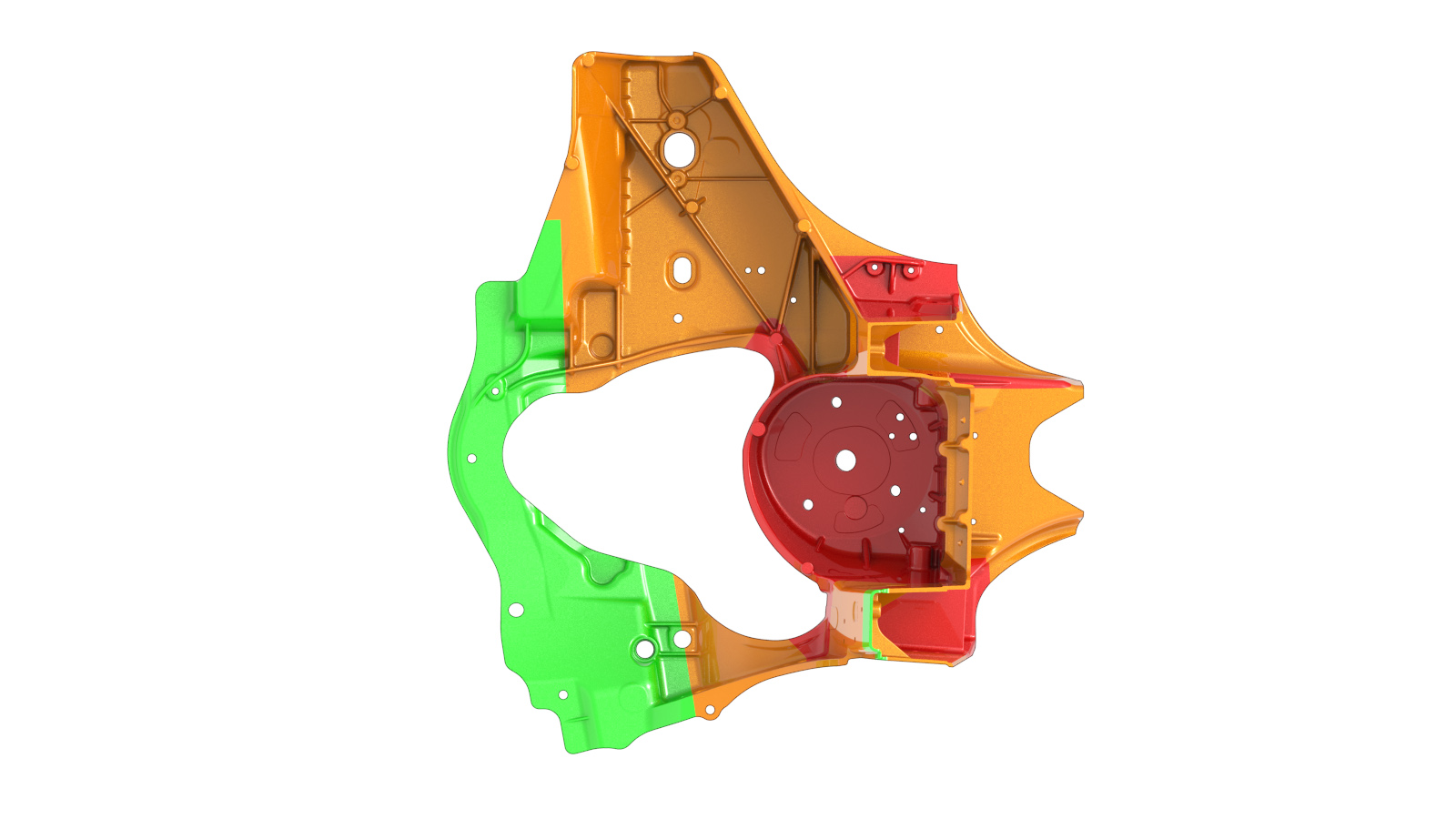 아래 이미지는 쇼크 타워를 여러 각도에서 보여주며 강조 표시된 영역이 포함되어 있습니다. 차량 쇼크 타워의 손상된 영역을 아래 이미지와 비교한 다음, 강조 표시된 영역의 색상에 해당하는 수리 기준을 사용하여 구성품의 손상된 영역을 수리할 수 있는지 결정합니다.