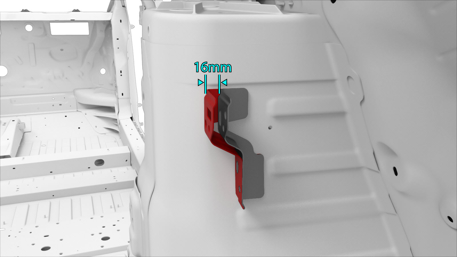 MerkMonter den nye hattehyllebraketten 16 mm innenfor den opprinnelige komponentplasseringen.