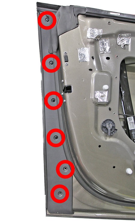 Bruk et plastkledningsverktøy til å fjerne trykklemmene (6 stk.) som fester klemmesensoren til døren.