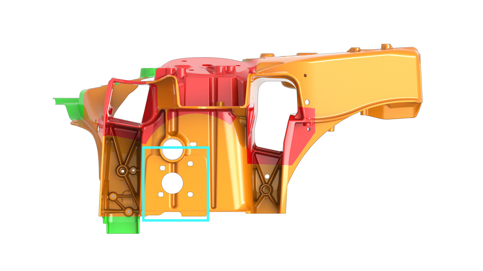下图从不同角度展示了减震塔,并突出显示了一些区域。将车辆减震塔的损坏区域与下图进行比较,然后根据突出显示区域颜色对应的维修条件确定组件损坏区域是否可维修的具体条件。