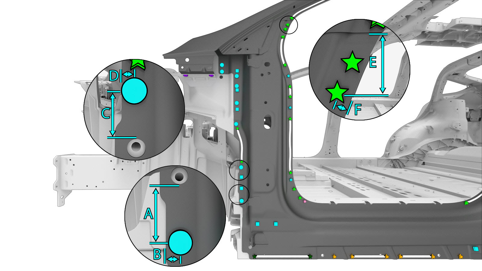 - Las partes de retirada y sustitución de este documento contienen la información necesaria para reemplazar toda la parte exterior del lateral de la carrocería. Si se sustituyen secciones de la parte exterior del lateral de la carrocería (en lugar de todo el conjunto exterior del lateral de la carrocería), utilice las partes correspondientes de cada paso para determinar qué piezas y sujeciones se necesitan y los pasos necesarios para completar la reparación.