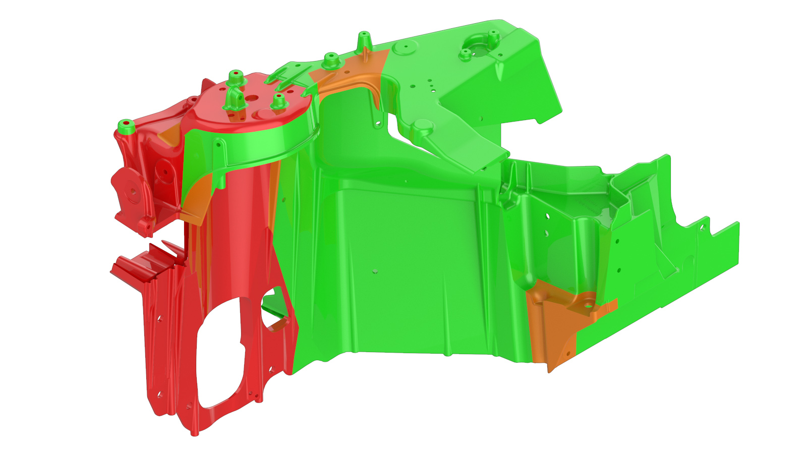 Le immagini seguenti mostrano la torretta dell’ammortizzatore pressofusa da diverse angolazioni e contengono alcune aree evidenziate. Confrontare l'area danneggiata della torretta dell’ammortizzatore del veicolo con le immagini sottostanti, quindi utilizzare i criteri di riparazione corrispondenti al colore dell'area evidenziata per individuare quelli da seguire per determinare se l'area danneggiata del componente può essere riparata.