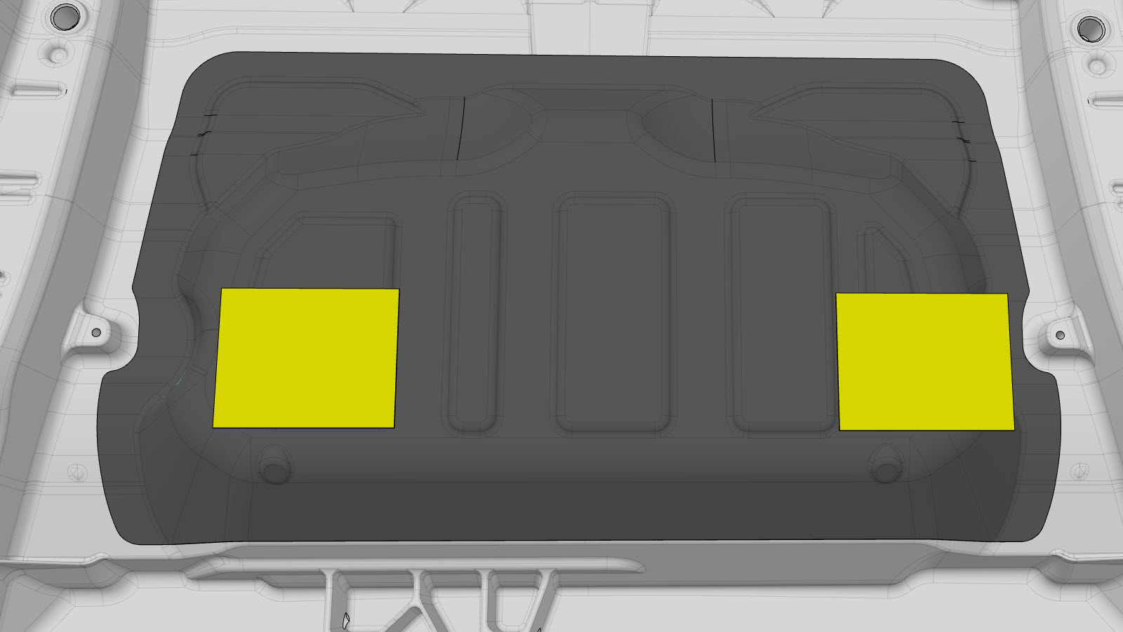 - Cubierta del motor (zona pequeña) incluye la retirada de la parte superior de la cubierta del motor, dejando los puntos de fijación existentes para el amortiguador de ruidos del vano del motor trasero, y la posterior instalación de la nueva cubierta del motor. Con la retroadaptación de la zona grande se retira menos parte de la cubierta del motor original que con la retroadaptación de la zona pequeña, y se reutilizan los puntos de fijación existentes para el amortiguador de ruidos del vano del motor trasero.