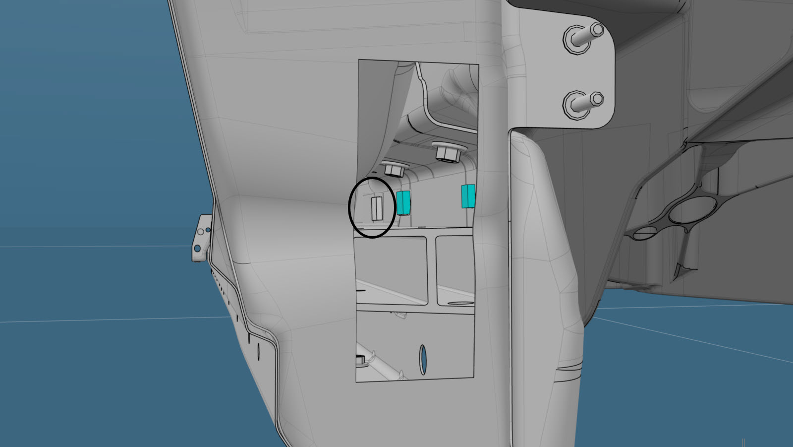 Installez l'écrou (numéro de pièce Tesla 1118837-00-A) dans le trou du montant B où se trouve l'enrouleur de ceinture de sécurité (indiqué en rouge).