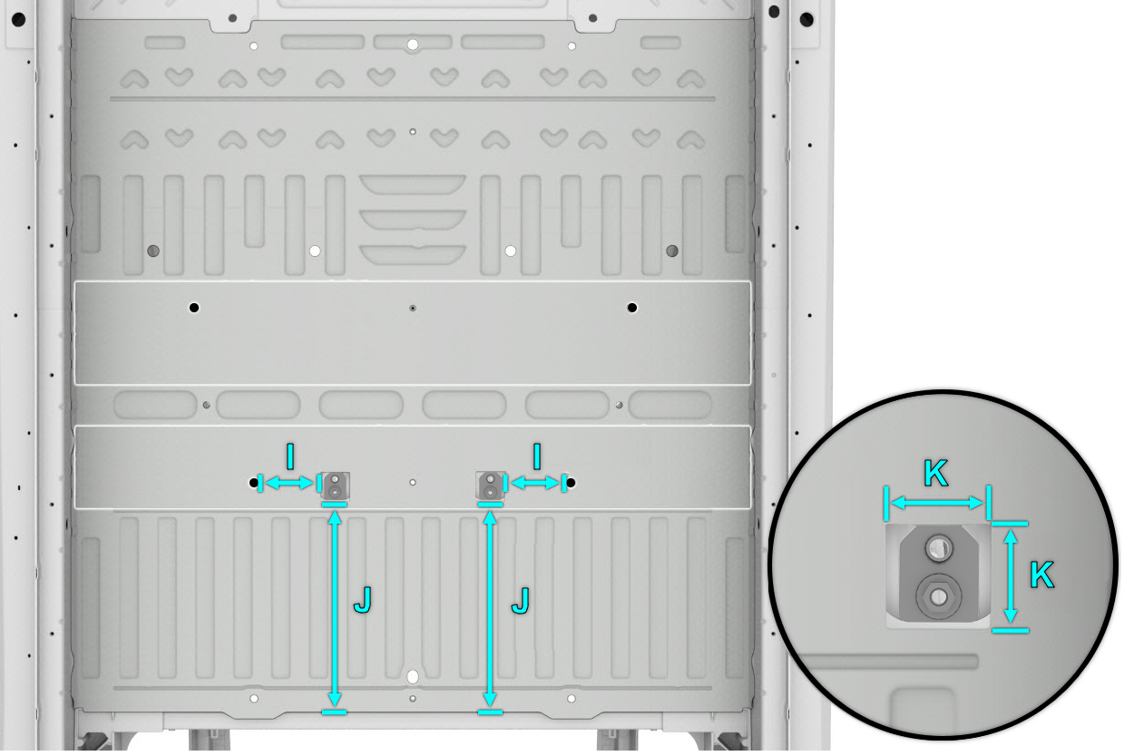 NotaNão corte o painel do piso sob qualquer suporte que não será substituído.NotaNão danifique as travessas do piso ao cortar o painel do piso.NotaA primeira imagem abaixo diz respeito aos reforços do apoio dianteiro do banco dianteiro. A segunda imagem diz respeito aos reforços do apoio traseiro do banco dianteiro.Apoios dianteiros:- A = 564 mm