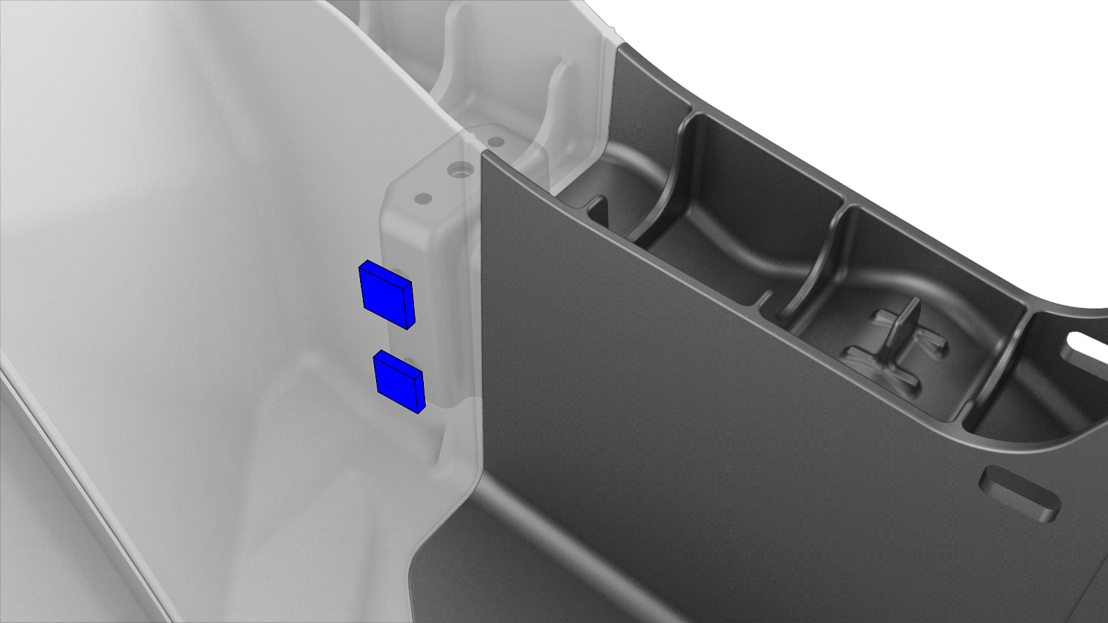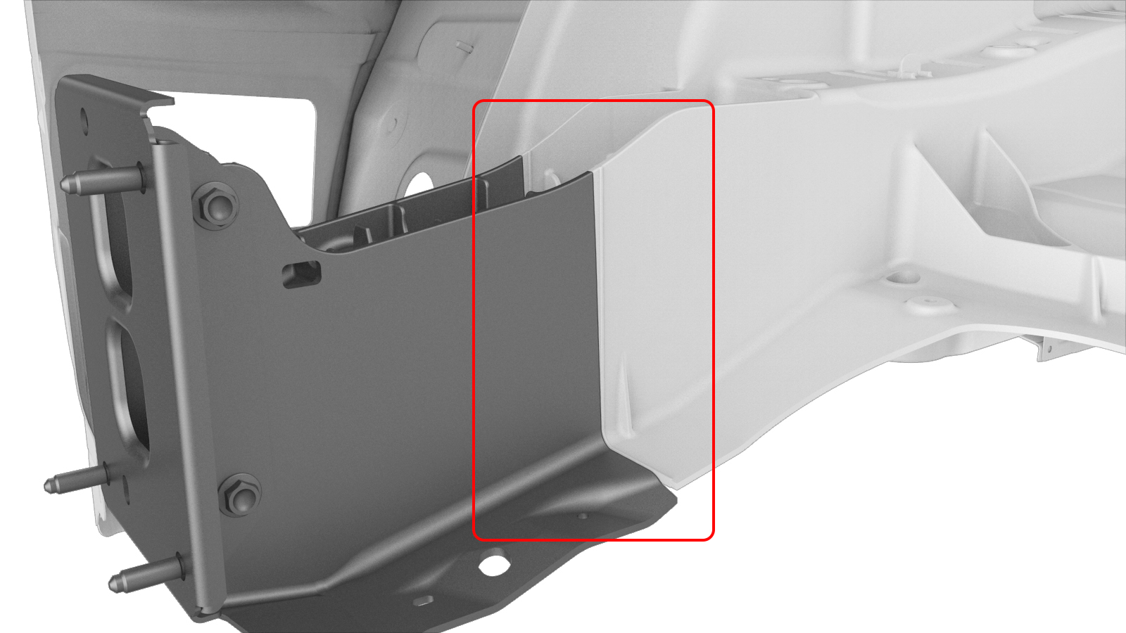 Lightly grind and smooth the edges of the service part in the area shown in red, and trim only as needed to ensure proper fitment. Do not grind more material than necessary, and do not cause a gap. Grinding may extend beyond the indicated area if necessary.NoteKeep the amount of material removed to the minimum necessary for proper fitment of the service part without introducing a gap. If a gap results from excessive grinding, contact Tesla Collision Repair for assistance.