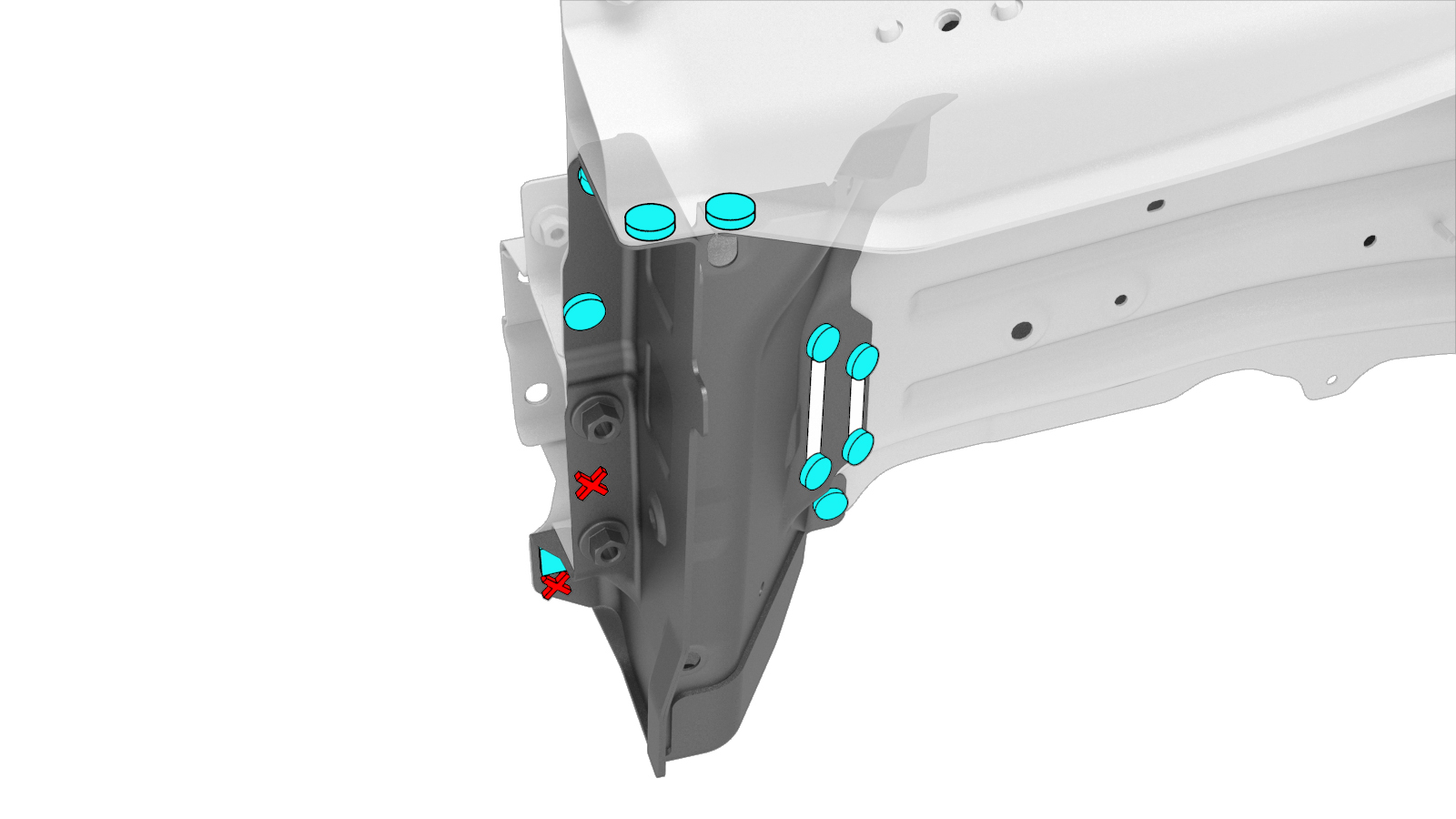 NoteA red X indicates a location where a factory-installed fastener is not being replaced.