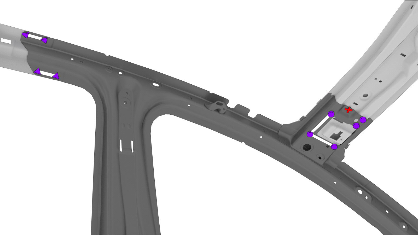 Scharniersäule an A-Säule, Schnittlinie A-Säule an B-Säule, Schnittlinie Scharniersäule an A-Säule, Verstärkungsplatte A-Säule an B-Säule, Verstärkungsplatte |
