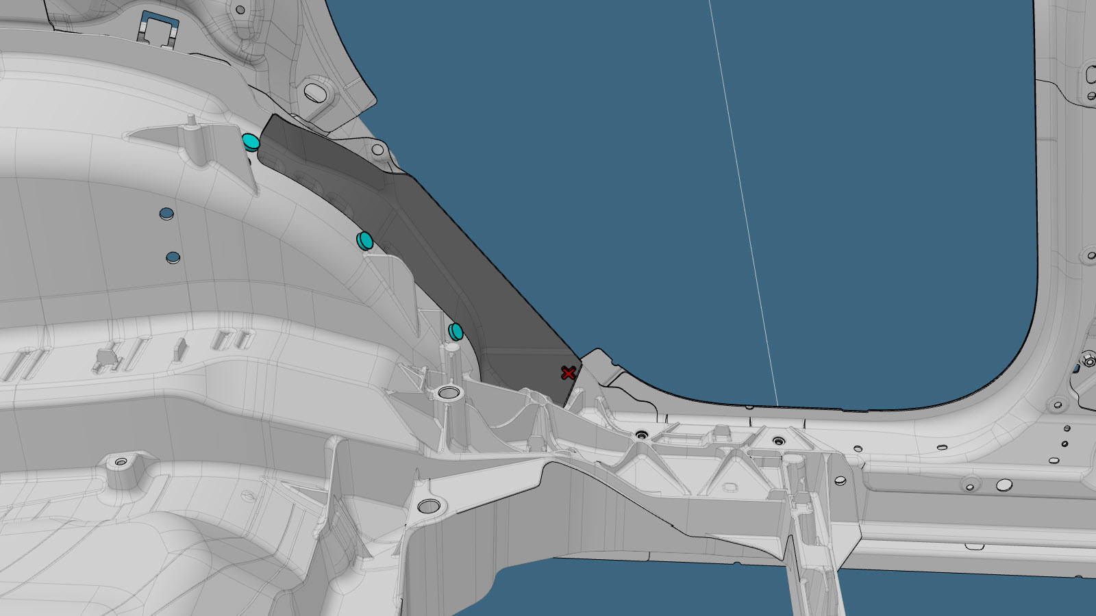 NotaLa pieza de repuesto se instala desde la parte inferior del paso de rueda.NotaUna X roja indica una ubicación en la que no se está sustituyendo una fijación instalada de fábrica.
