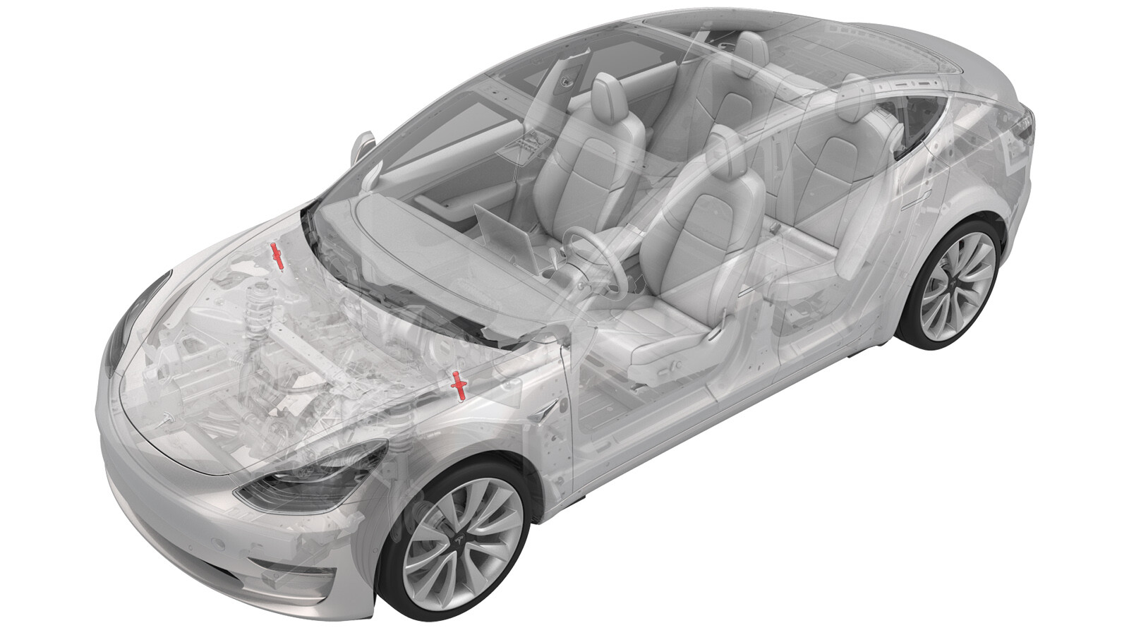 Ensemble structurel Model Y Les véhicules sont dotés de composants de protection des piétons comme un tube de capteur de pression et des actionneurs de capot.