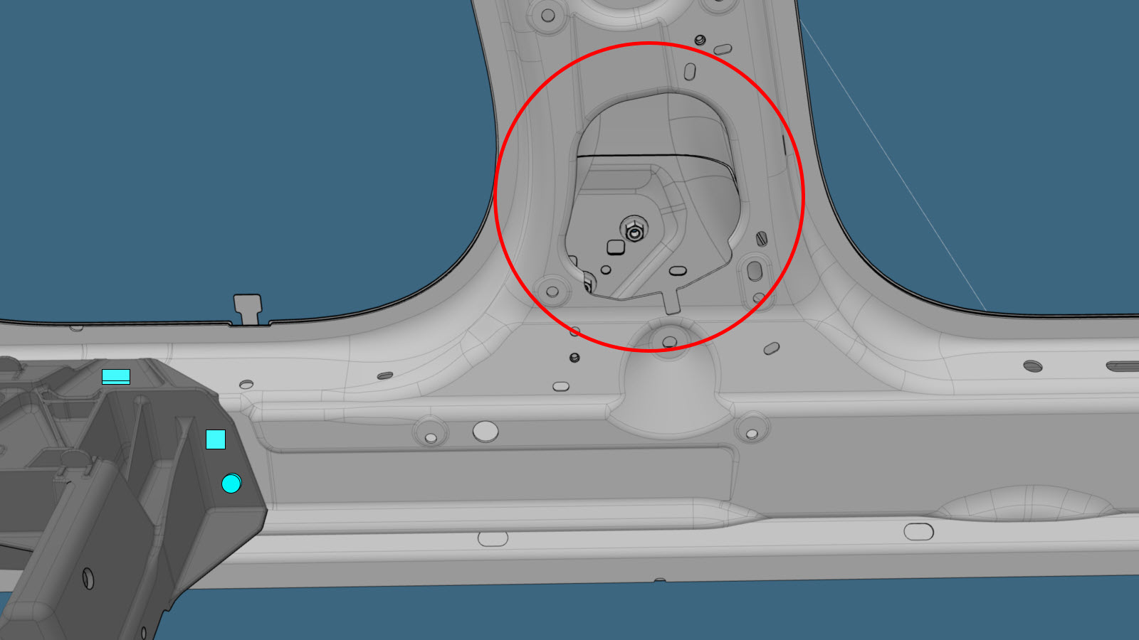 Installez l'écrou (numéro de pièce Tesla 1118837-00-A) dans le trou du montant B où se trouve l'enrouleur de ceinture de sécurité (indiqué en rouge).
