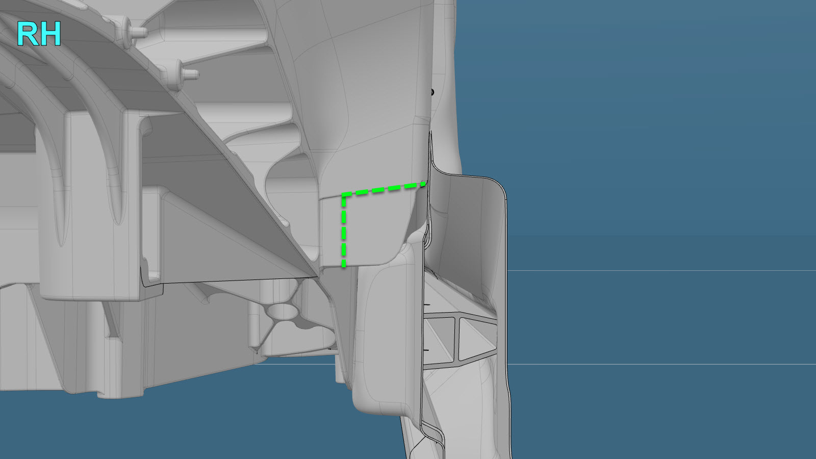 הערההמדדים המוצגים מציינים את הגבולות החיצוניים (גודל מרבי) של אזור התיקון, ואזור התיקון הקטן יותר ניתן לחיתוך. אם הנזק עובר אל מעבר לאזור זה, צרו קשר עם תיקוני התנגשות של Tesla לסיוע.הערההשתמשו בחלק השירות כסימוכין עבור הסרת החומר מיציקת תת-המרכב האחורי. חתכו חתיכה גדולה בהתאם לצורך עד שחלק השירות ייכנס לתוך אזור התיקון.אזהרההחלק הנותר של בית ההגה חייב לחפוף את חלק השירות לפחות ב-25 מ"מ באזורים הפנימיים.או SPR של המפעל