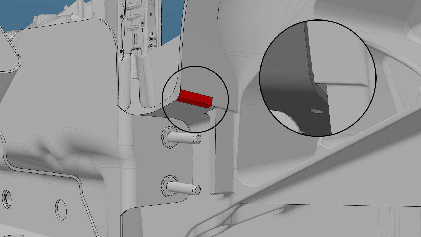 הסירו את כמות החומר המינימלית הדרושה כדי להבטיח התאמה נכונה ללא התנגשויות, כפי שמוצג בבועת התקריב.הערהחתכו רק את כמות החומר הדרושה להתקנת הרכיב החדש כראוי. הסרת חומר עודף עשויה להחליש את אזור התיקון ליד הרכיב החדש.